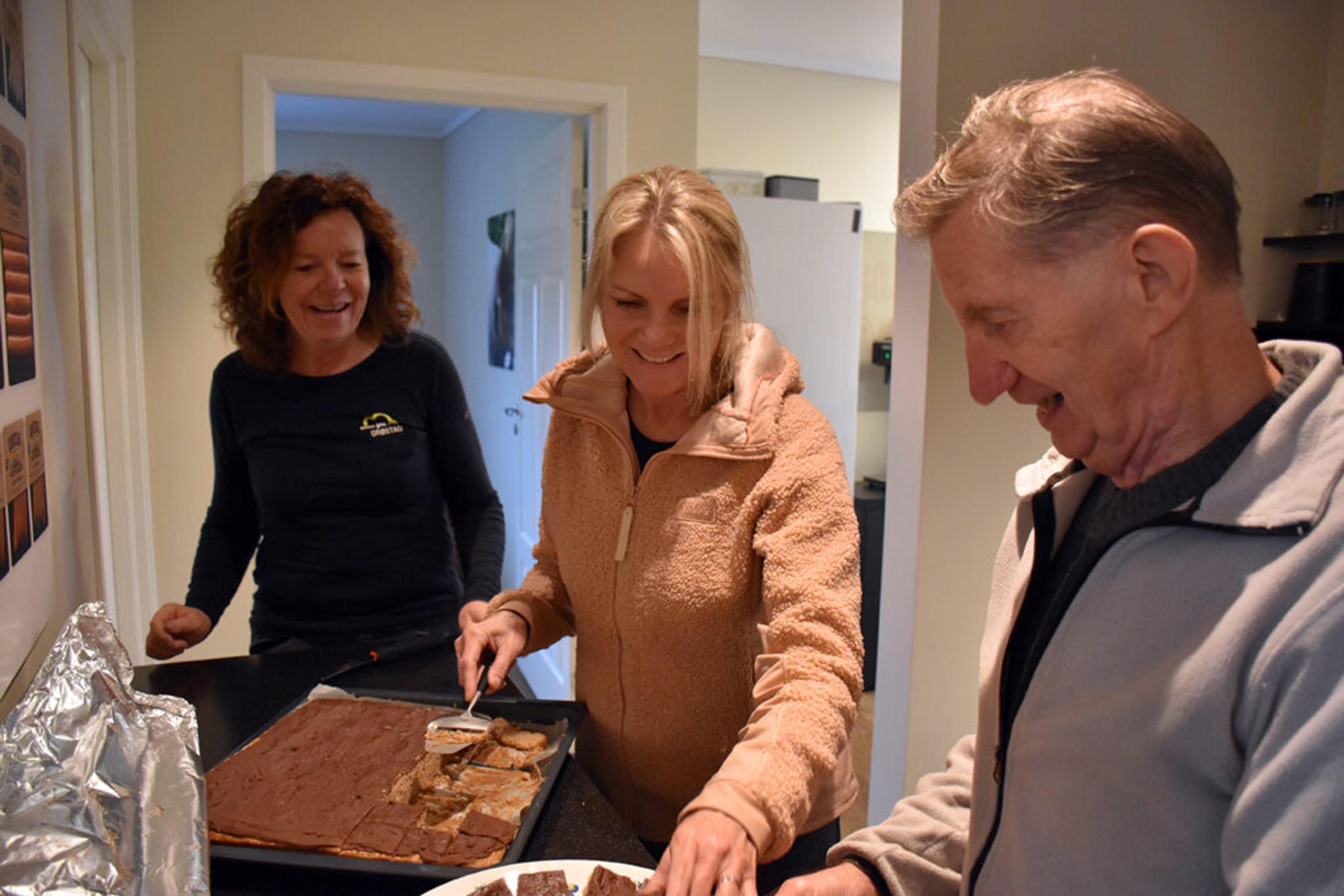 JULEBAKST: Her serveres det sjokoladekake, men det er også julebakst på gang på Grøstad gård. Britt Jacobsen og Gry Beate Knapstad skal servere sammen med Alf Gunnar Johnsen. Foto: Stian Ormestad, ReAvisa.