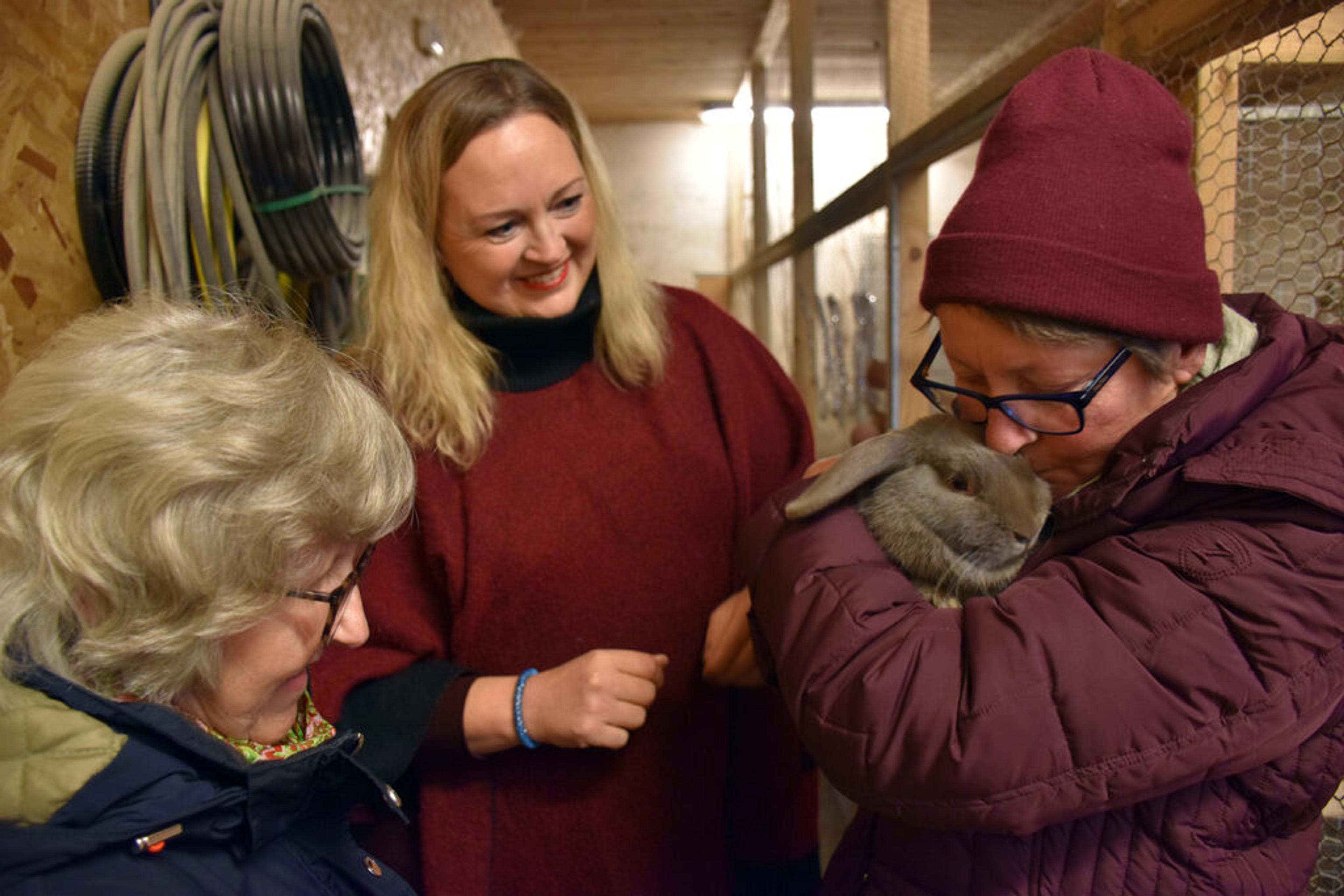 KANIN-KOS: Eva og Birgit forteller at de aldri har vært glad i å sitte stille, de elsker å være i aktivitet på gården. Med mating av dyra følger det også litt kos. Foto: Stian Ormestad, ReAvisa.