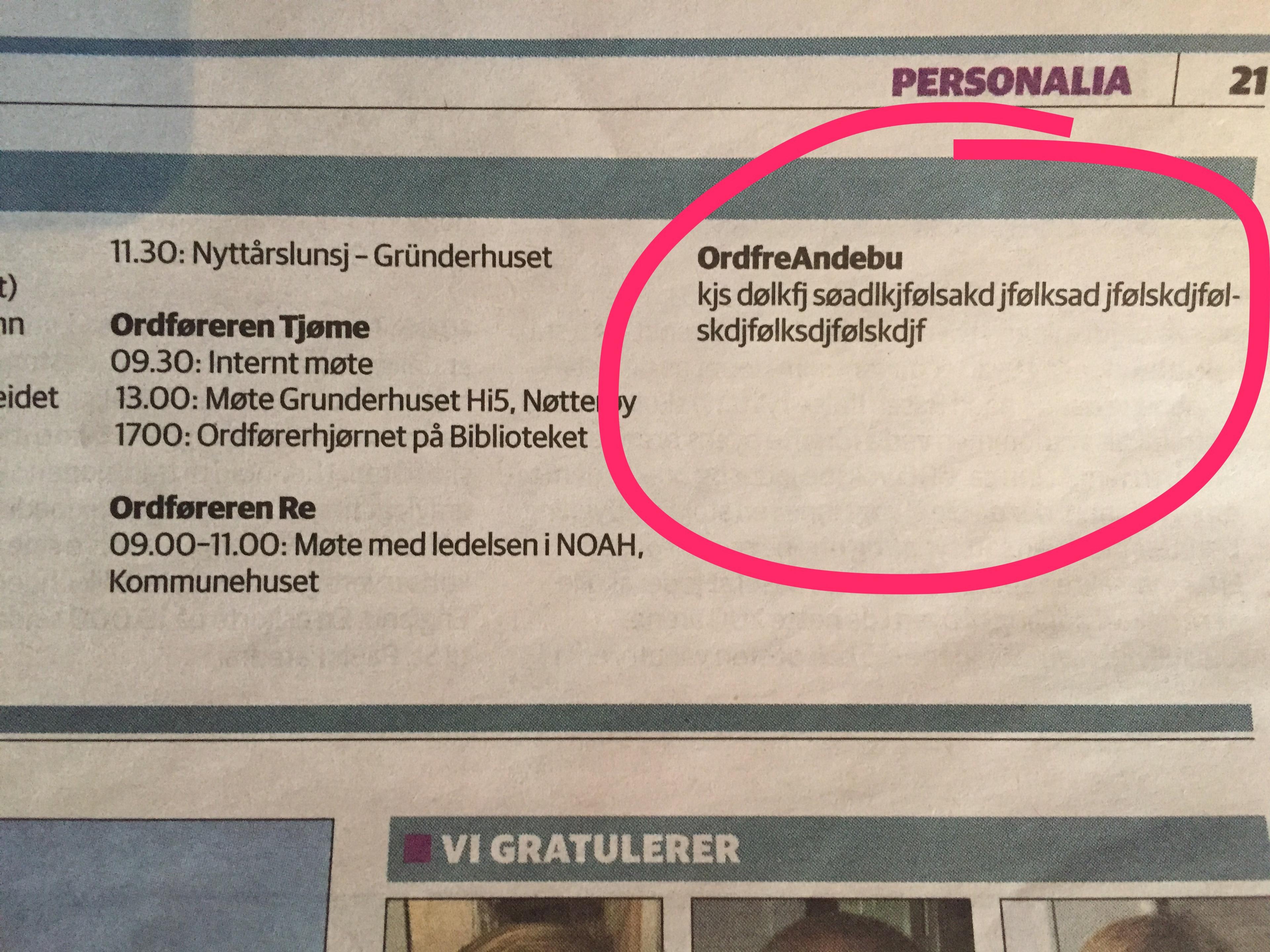 Vi siterer ordrett: «OrdfreAndebu: kjs dølkfj søadlkjfløsakd jfølksad jfølskdjføl-skjdjfølksdjfølskfdjf».