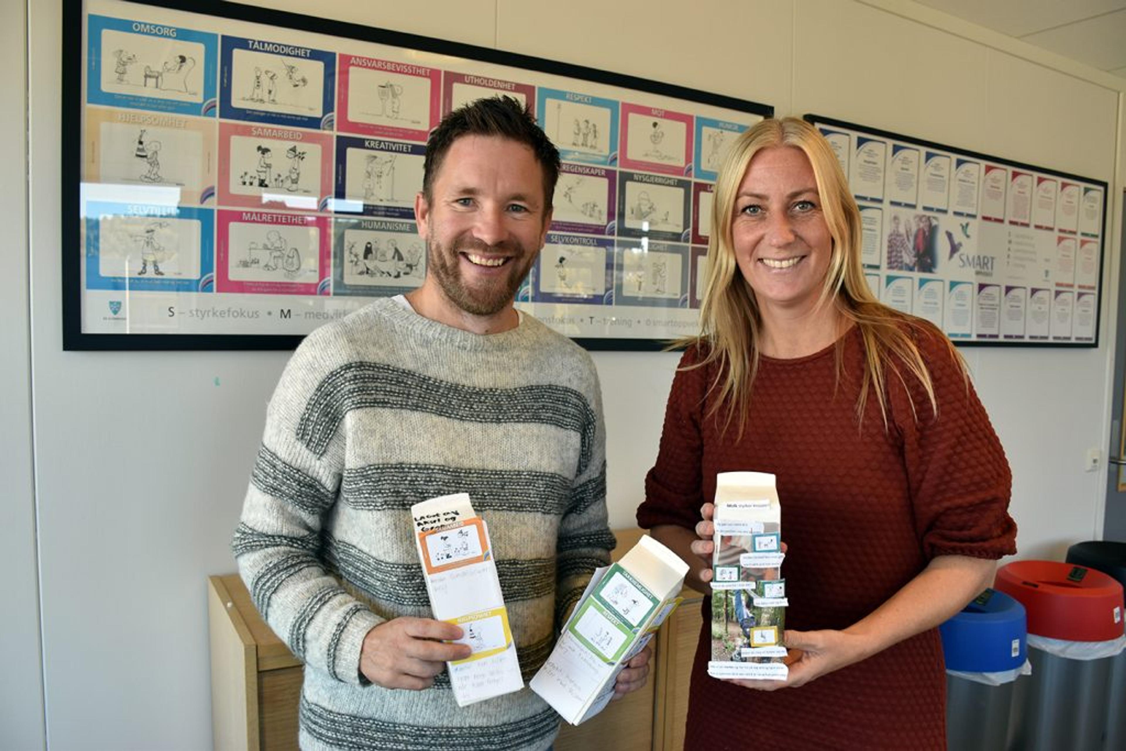 SMART MELKEKARTONG: Henrik Kopstad Arnesen og Linn Tveiten ved SMART-senteret i Re med prototypene til melkekartongene som nå er ute i butikkene. Foto: Stian Ormestad, ReAvisa.