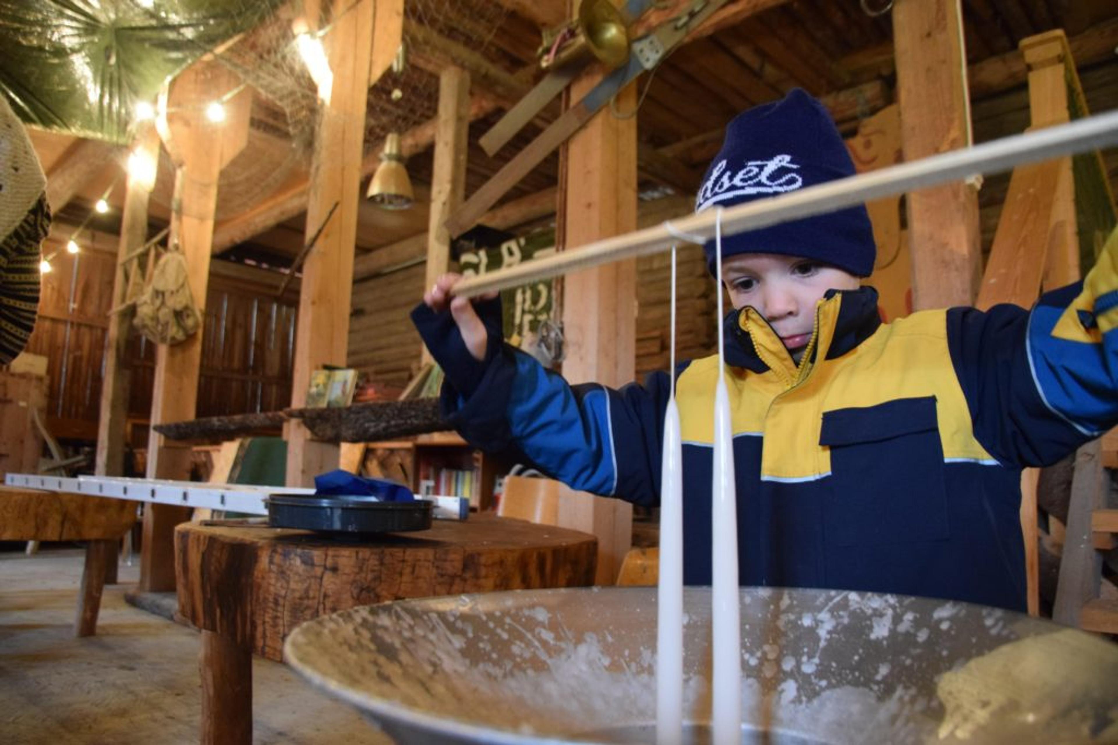 DYPPER LYS: Fillip Mæland Bjølgerud (6) dypper lys som mormor skal få i julegave. Da ReAvisa spør om det er moro å dyppe lys, svarer han «bare bitte-litt, egentlig, men det er moro at mormor skal få dem!». Foto: Stian Ormestad.