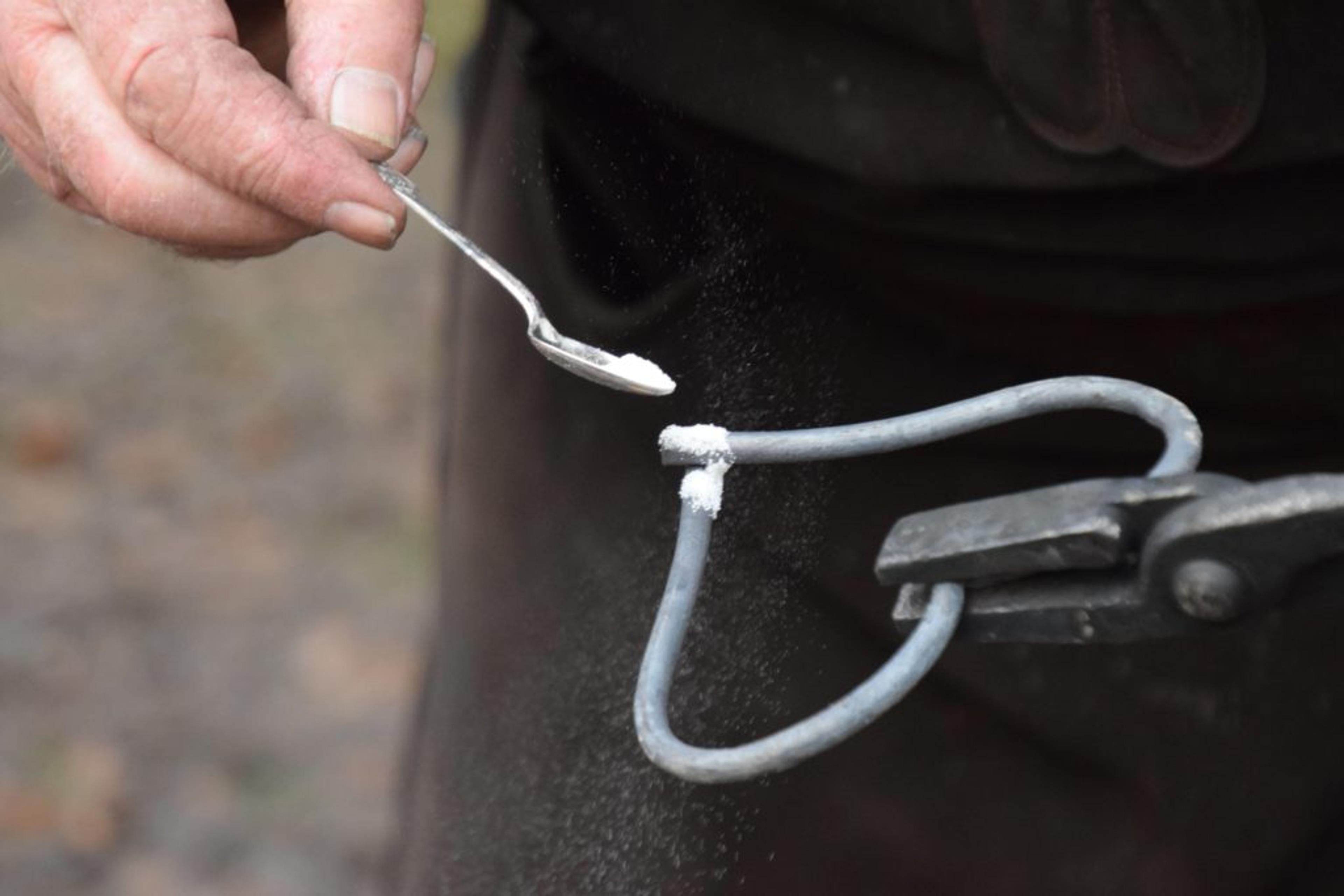 SVEISING PÅ GAMLEMÅTEN: Det samme stoffet som epletrær trenger for å få fine epler, strøs på jernet for å sveise endene sammen, forklarer smednissen. Foto: Stian Ormestad.