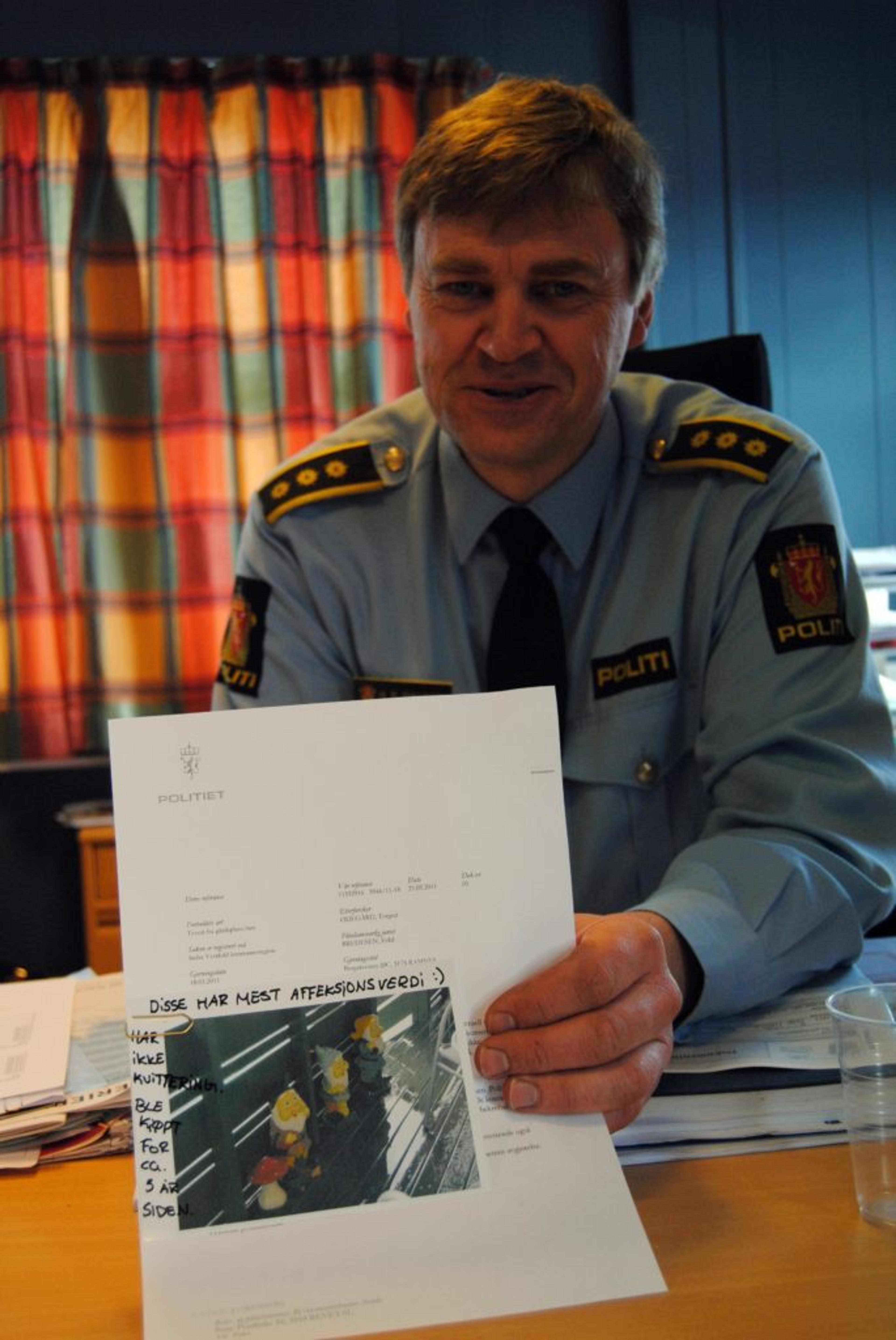 INGEN SAK ER FOR LITEN: Det dukker opp noen småsaker på lensmannskontoret på Revetal, men også de må tas på alvor. Lensmann Hans-Petter Gulliksen håper å kunne løse dverg-mysteriet i Bergsåsen. Foto: Stian Ormestad.