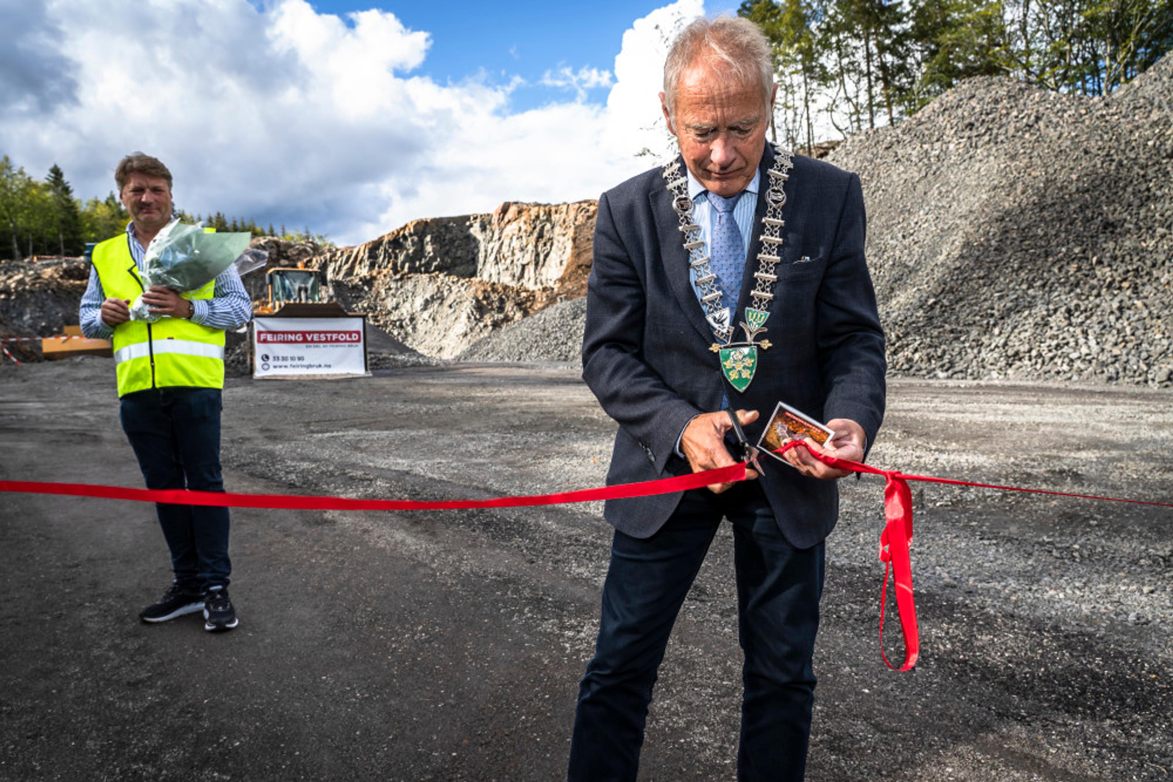 RE PUKKVERK: Res nyeste pukkverk, åpnet med snorklipp ved Re-ordfører Thorvald Hillestad, er et datterselskap av det familieeide konsernet Feiring AS som har 12 stasjonære og 20 mobile knuseanlegg rundt om på Østlandet. Foto: Pressemelding.