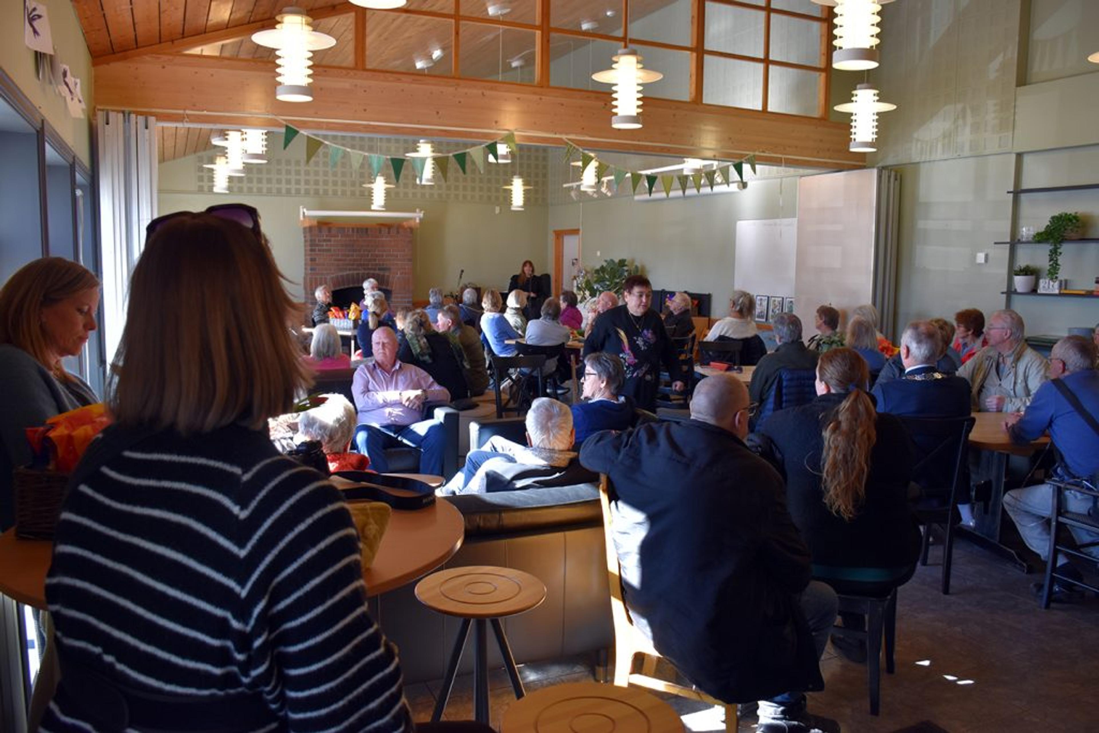 FOLKSOMT: Mange hadde tatt turen til Brårsenteret, der Re frivilligsentral skal holde hus. Under den offisielle åpninga var det taler, kake og kaffe, pluss kulturelle innslag. Foto: Stian Ormestad, ReAvisa.