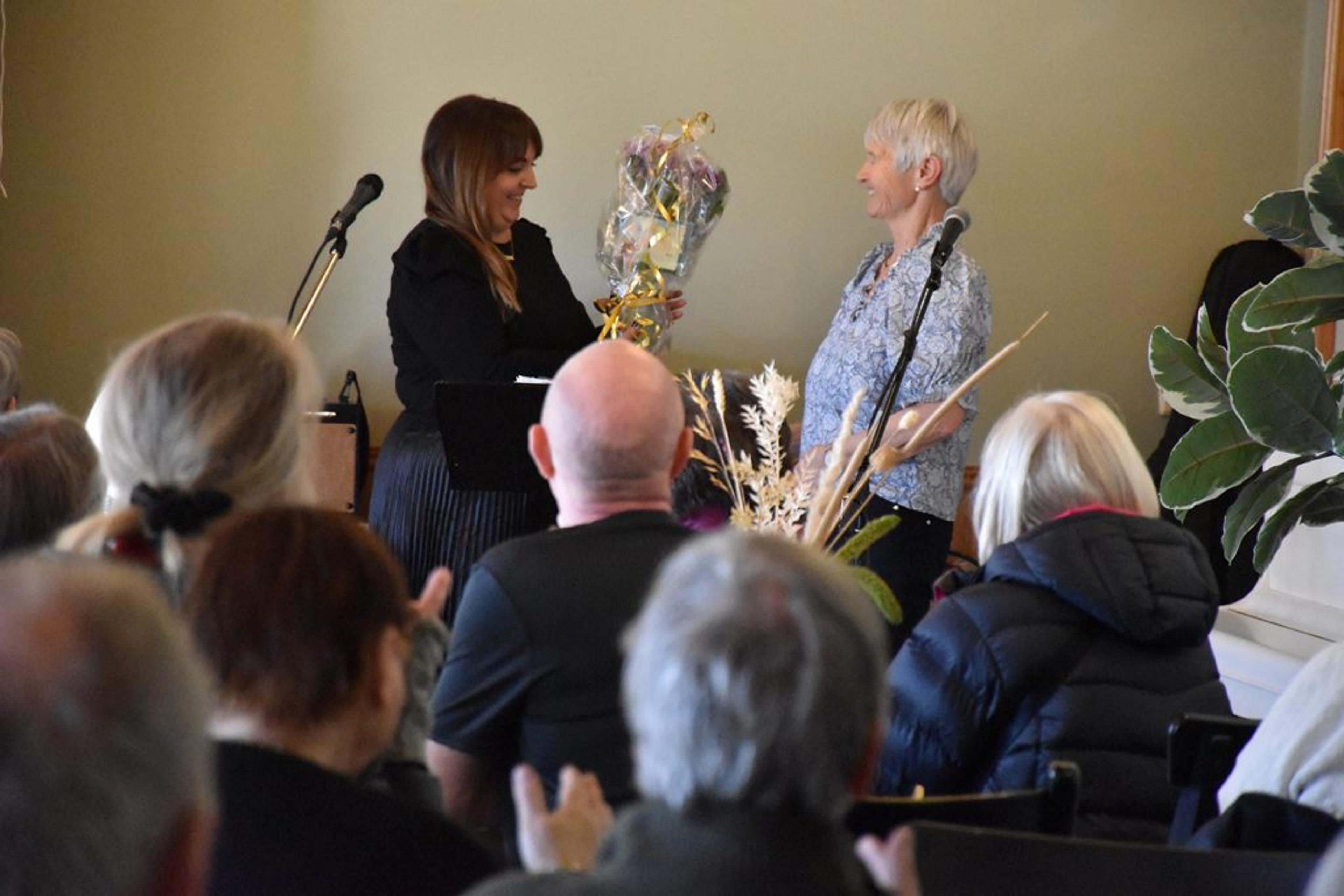 KOMMUNALE LEDERE: Leder av Re frivilligsentral Rina Winnem-Tønder får blomster av leder i virksomhet for mestring og forebygging Grethe Johnsen. Foto: Stian Ormestad, ReAvisa.