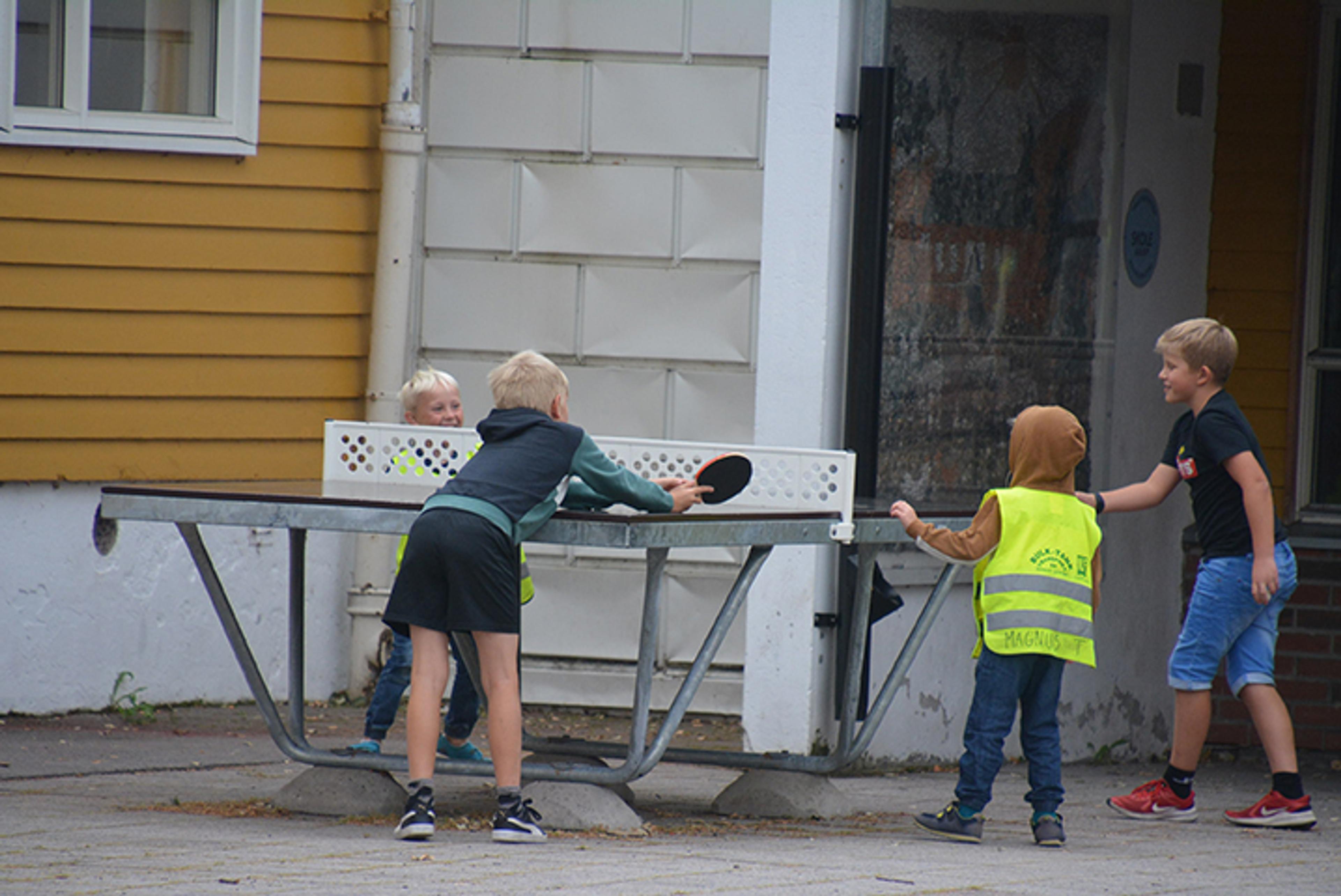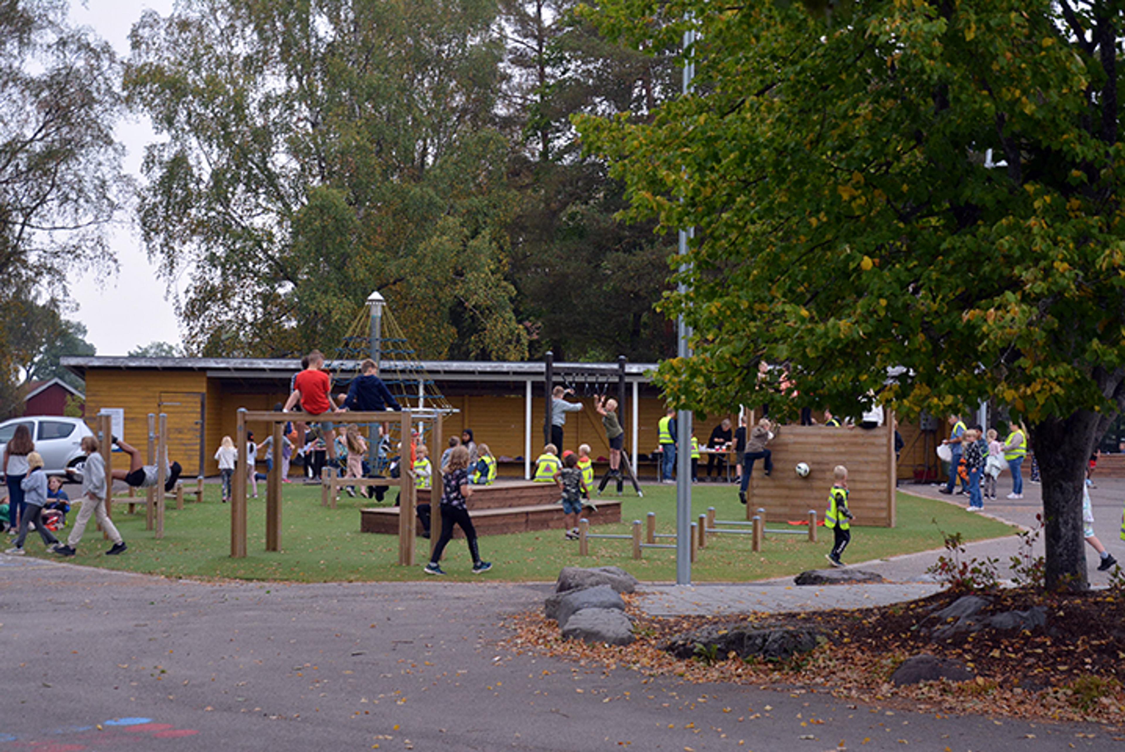 LEK OG MORO: Skolegården er full av lek og moro, nå som alle tre prosjektene for uteområdene på Kirkevoll skole er ferdigstilt. Foto: Stian Ormestad.