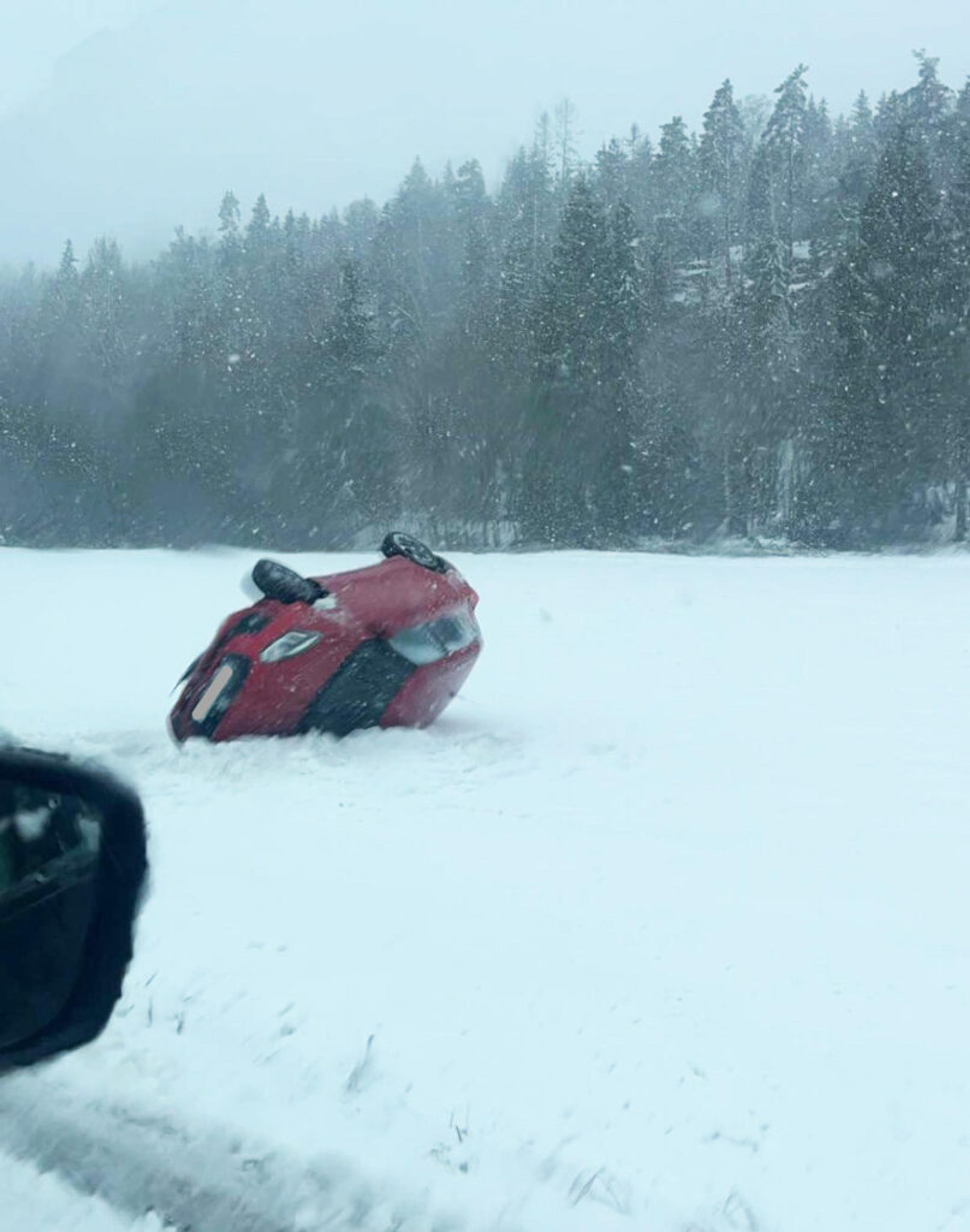 PÅ TAKET: Bilen havna godt utpå jordet da det gikk gæli for en uheldig bilist i snøværet lørdag 16. mars 2024. Foto: ReAvisa-tipser.