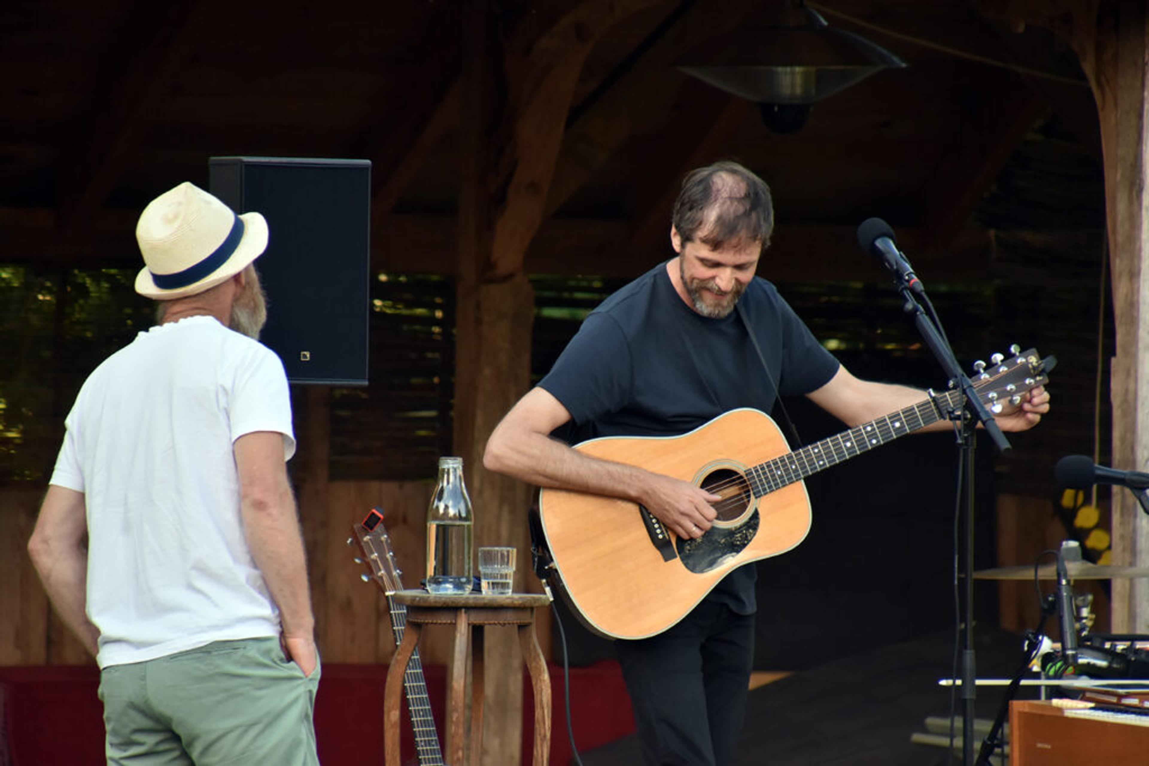 TRAVEL VISESANGER: Erik Lukashaugen har med seg Tarjei Nysted på Holt gård-scenen. Dette er en av mange konserter land og strand rundt – og heldigvis stakk den travle visesangeren innom Re. Foto: Stian Ormestad.