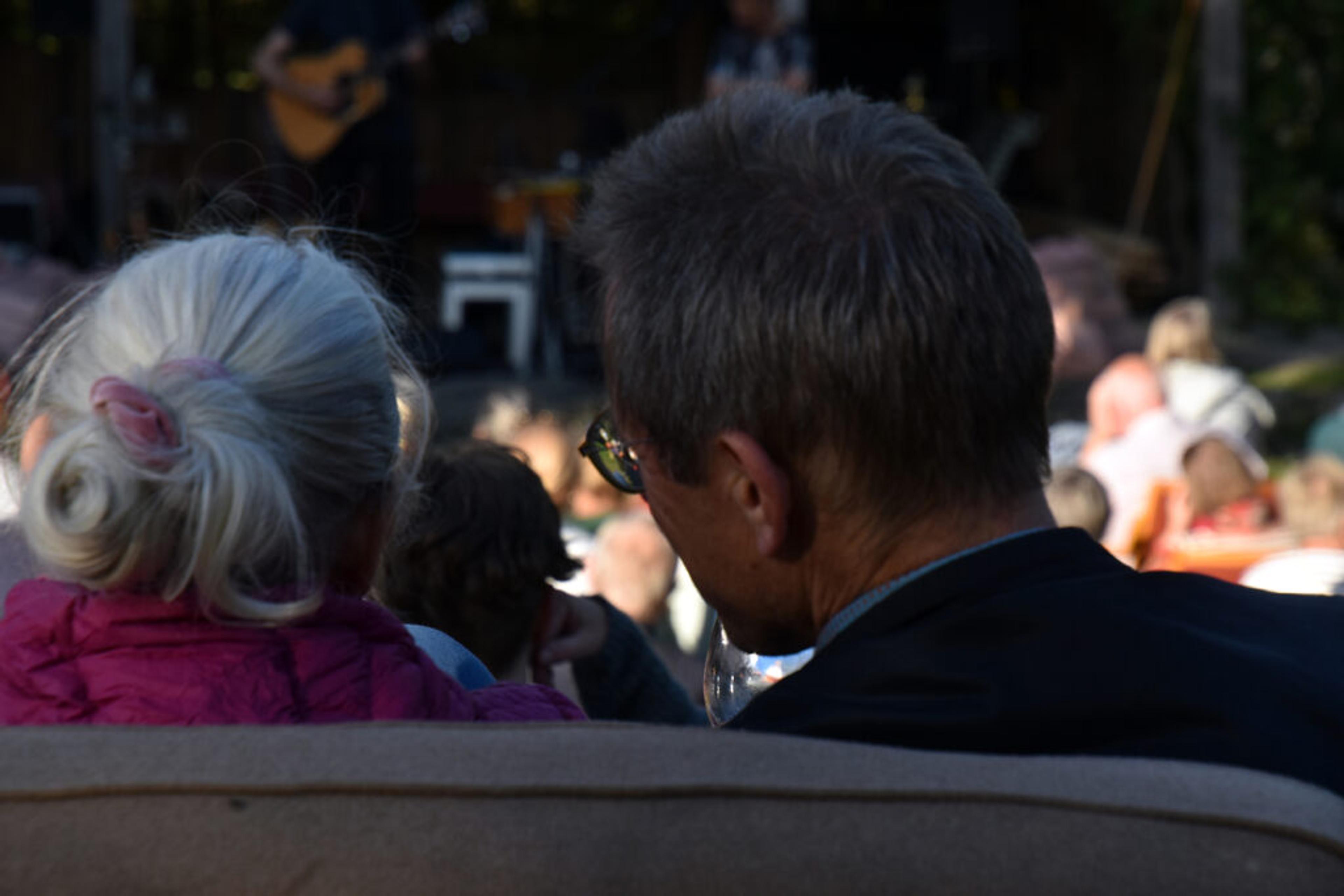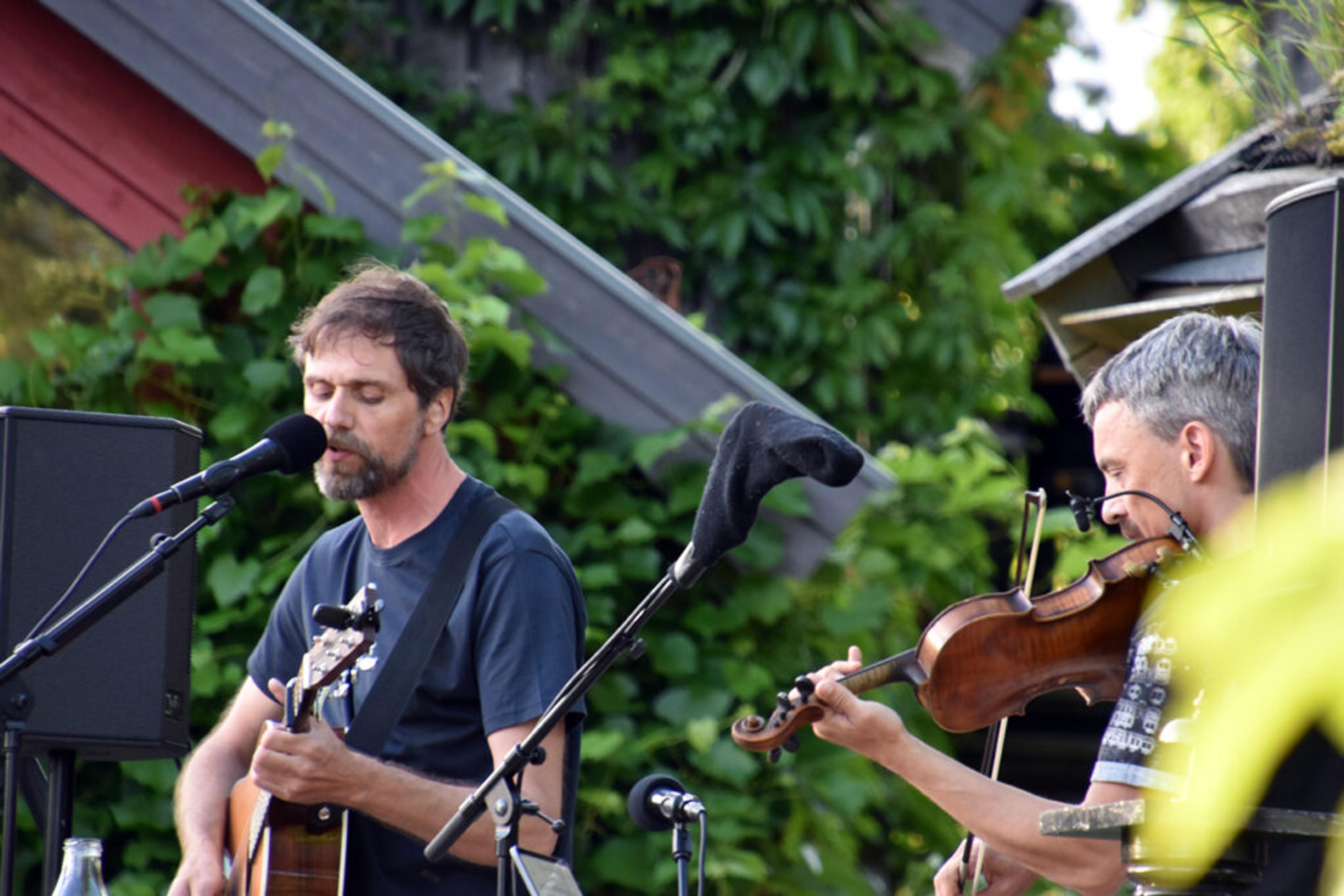 APPLAUS: Folk koser seg på tunet med trivelige toner, og Erik Lukashaugen og Tarjei Nysted får velfortjent applaus. Foto: Stian Ormestad.