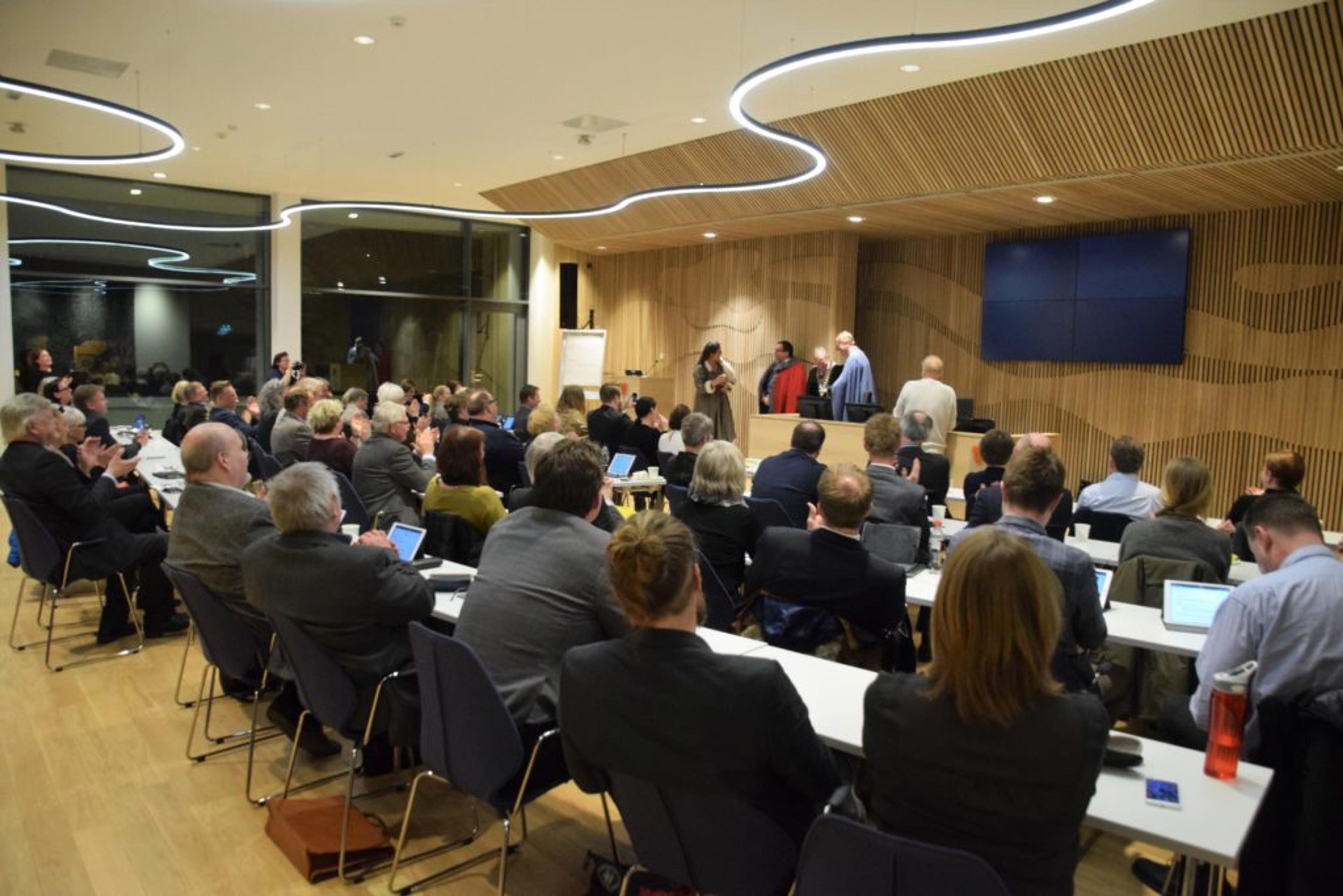 SAMKJØRING MED TØNSBERG: I Tønsberg er det fire uker sommerstengte barnehager. Dette er et av flere grep for å samkjøre de to kommunene som om drøyt to år er en. Bildet er fra det første felles kommunestyremøtet tidligere i år. Foto: Stian Ormestad.