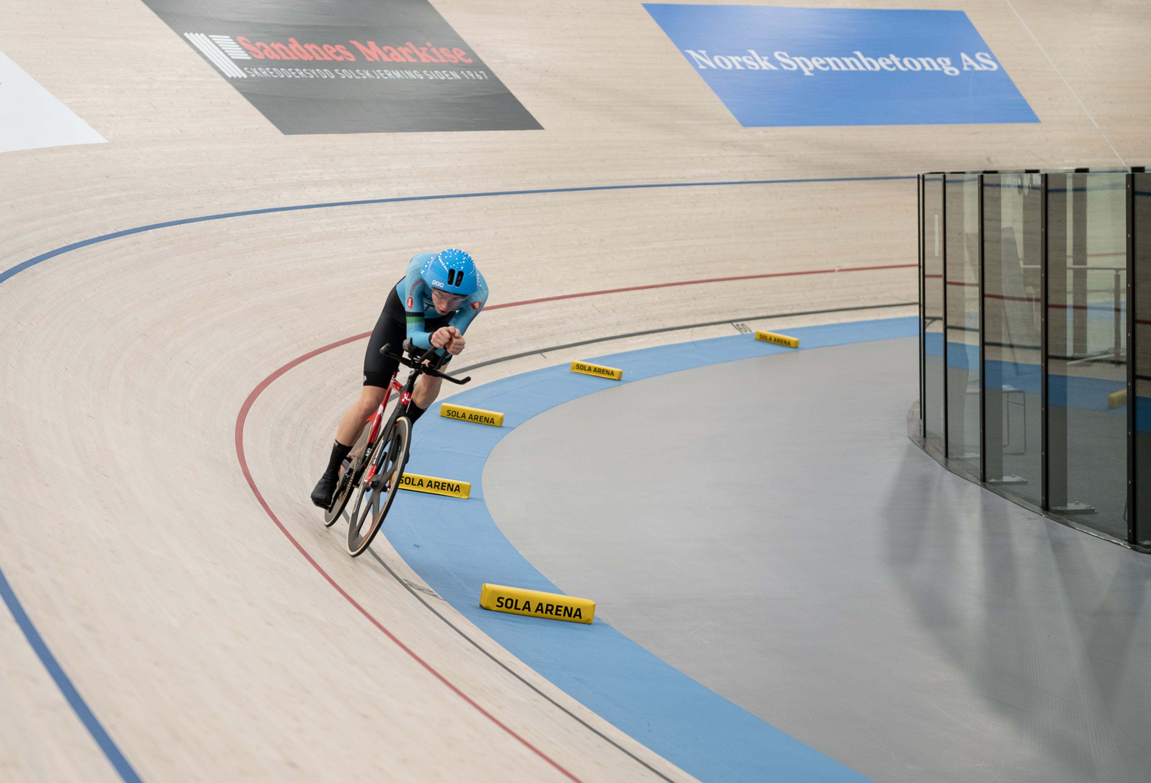 NY NORSK VELODROM: Lenge har nordmenn reist til for eksempel Danmark for å sykle i velodrom, men i år sto den første og foreløpig eneste norske velodromen ferdig på Sola. Det var der norgesrekorden ble satt nå før jul 2021. Foto: Kjetil Birkedal Pettersen.