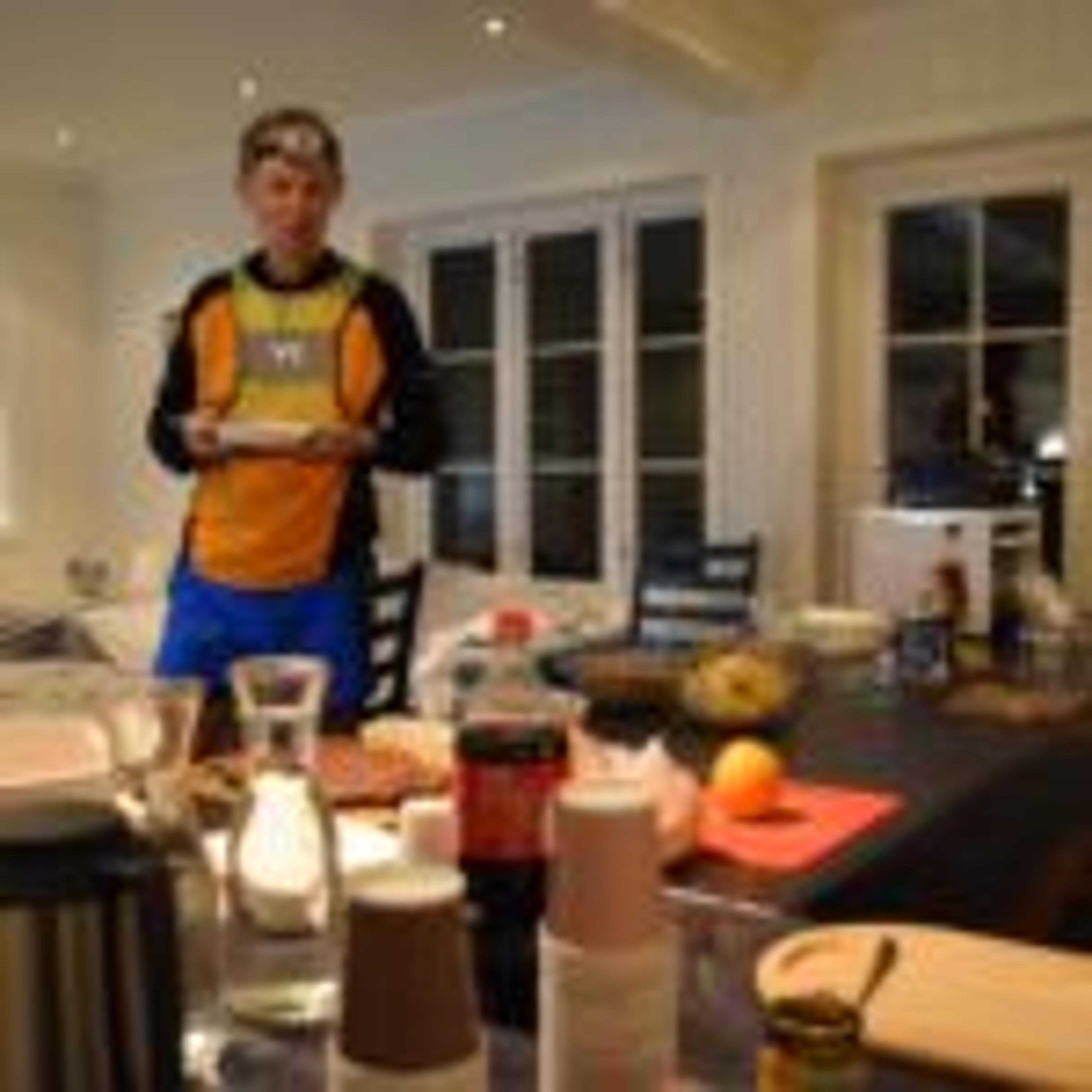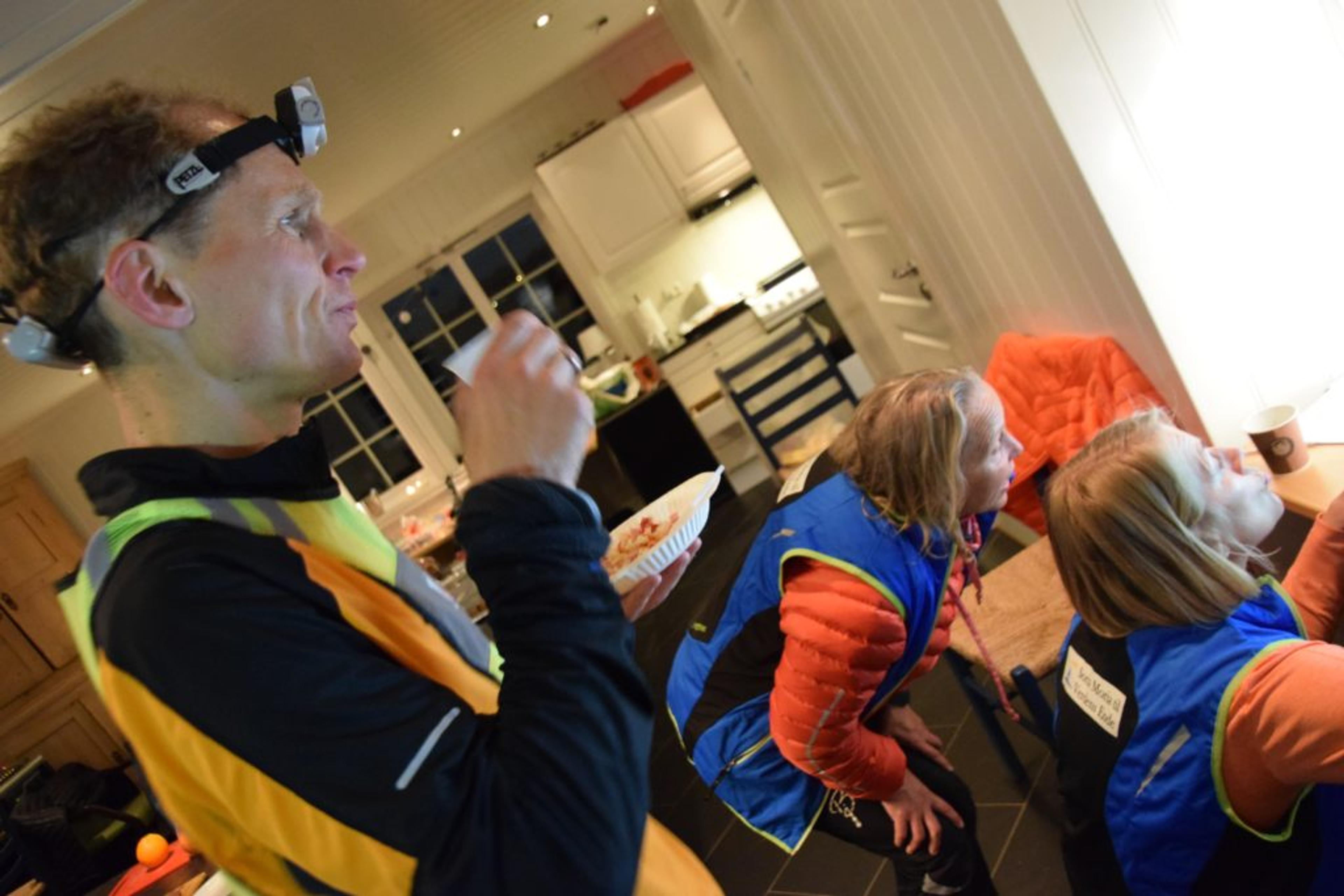 TAKK FOR MATEN! En siste matbit i lomma, så er det å løpe ut i natta igjen – og jogge helt til sola har stått opp. Foto: Stian Ormestad.