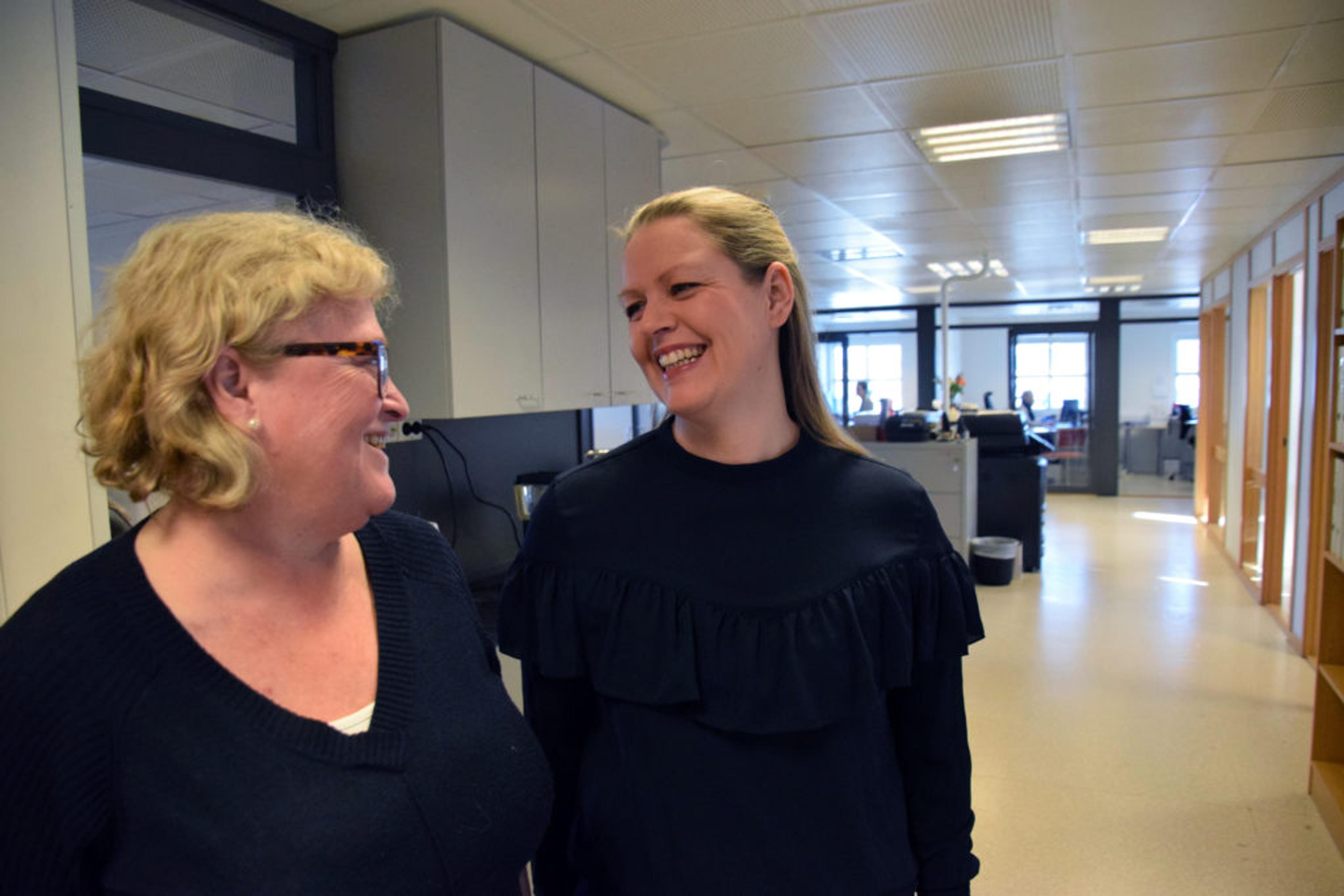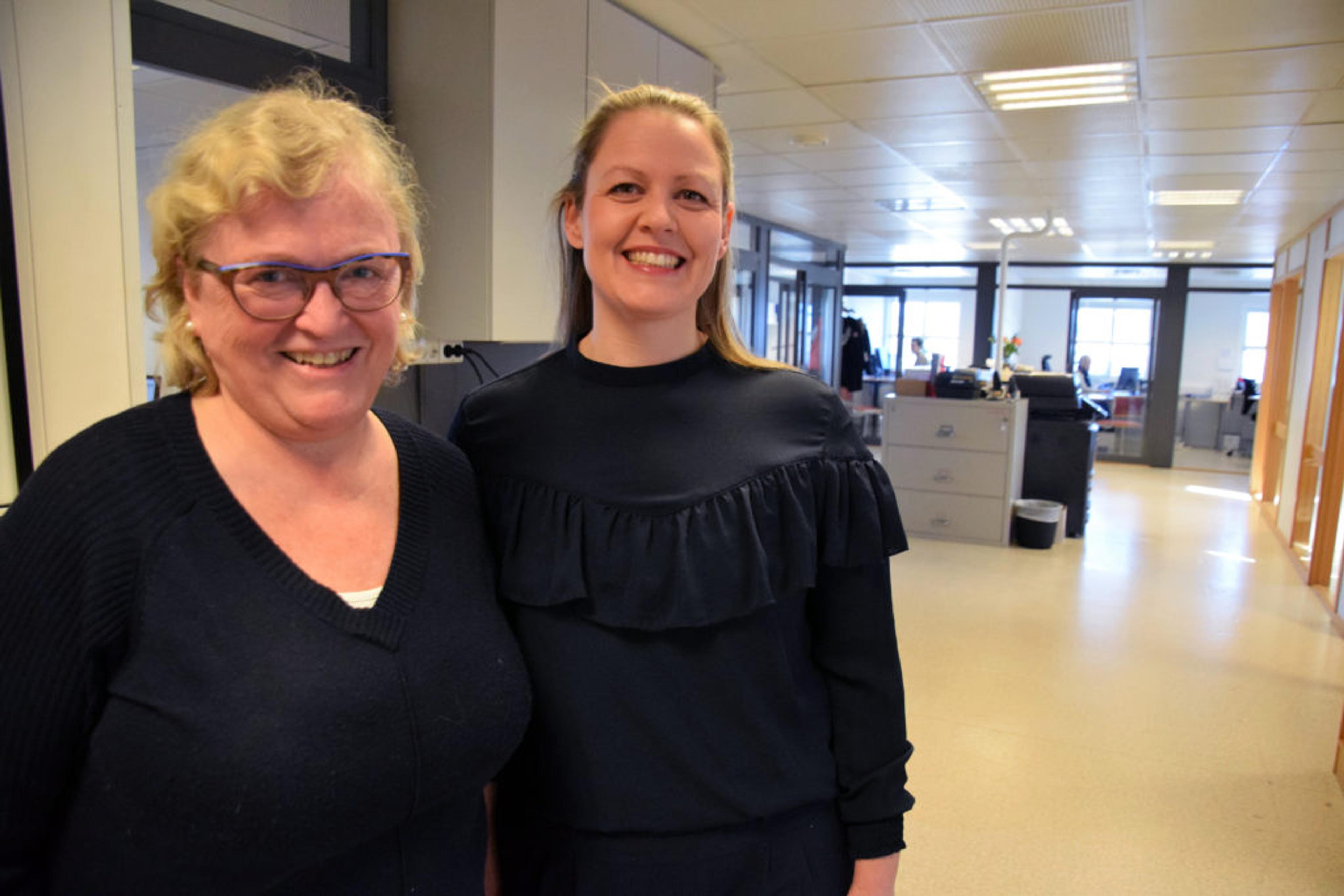 VELKOMMEN! Marit Sibbern og Inger Lise Jensen ønsker velkommen til åpen dag hos ROS økonomi i Næringsbygget på Revetal fredag 16. mars 2018. Foto: Stian Ormestad.