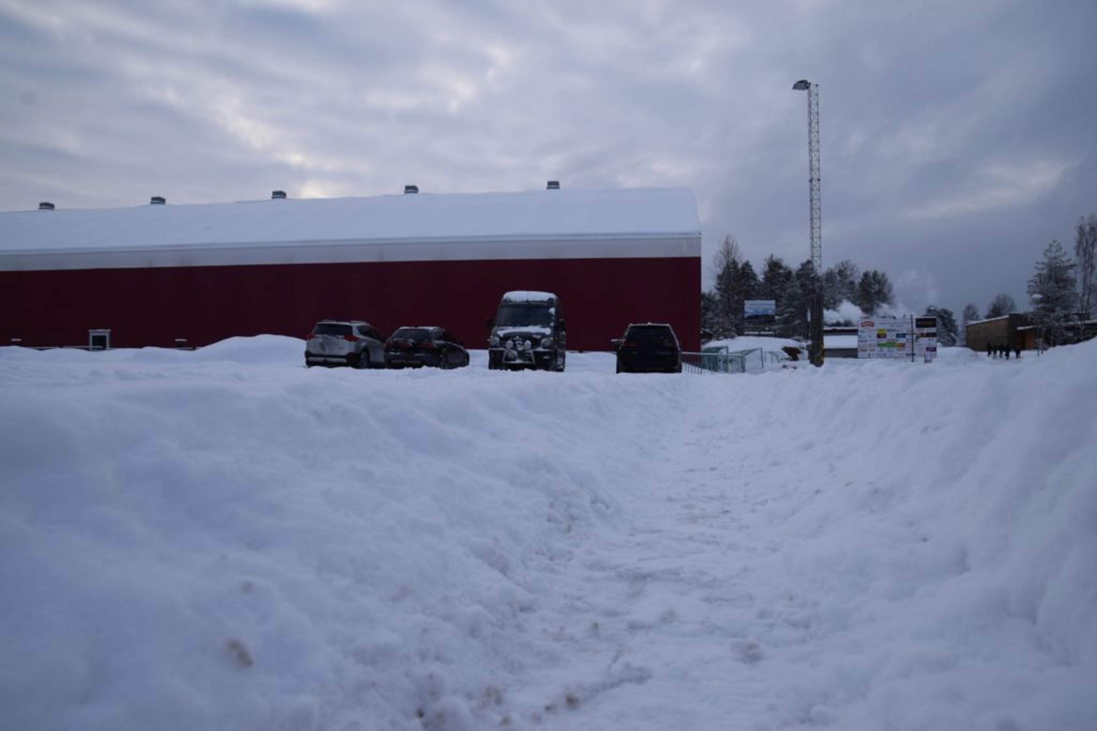 BRØYTER SEG VEI: Fire biler har våget seg inn på den store parkeringsplassen ved kaldhallen lørdag. Foto: Stian Ormestad.