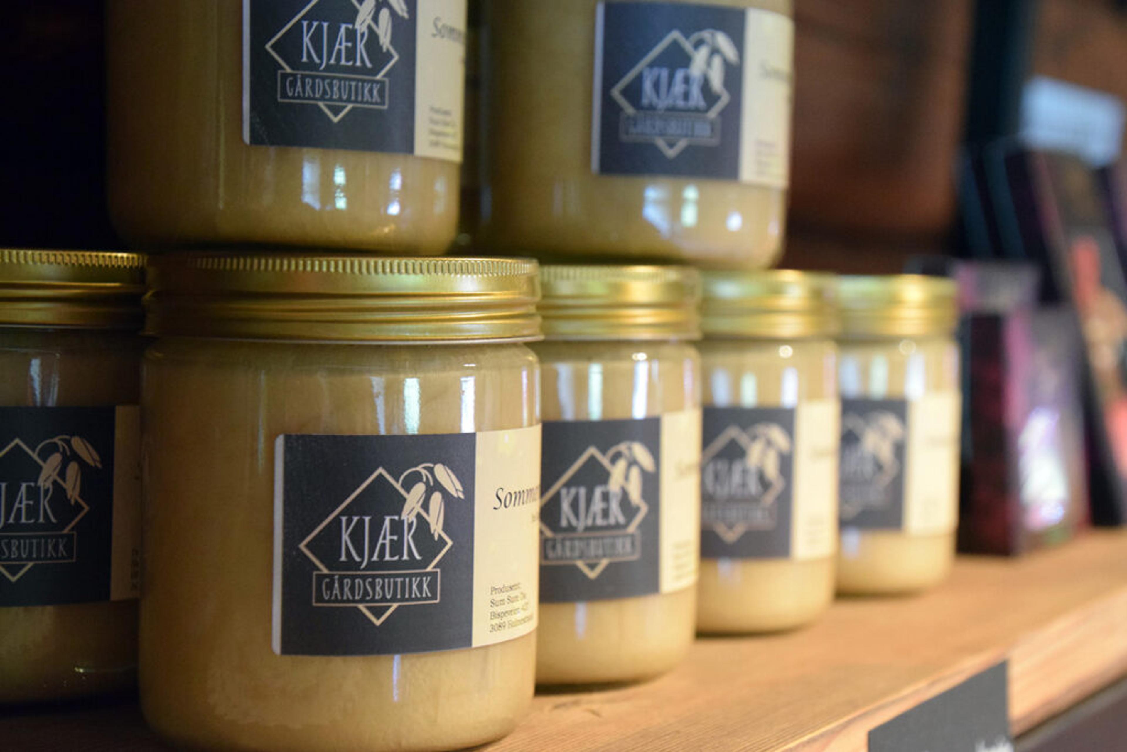 HYLLEVARE: Honning fra egen gård selges også i gårdsbutikken. Foto: Stian Ormestad.
