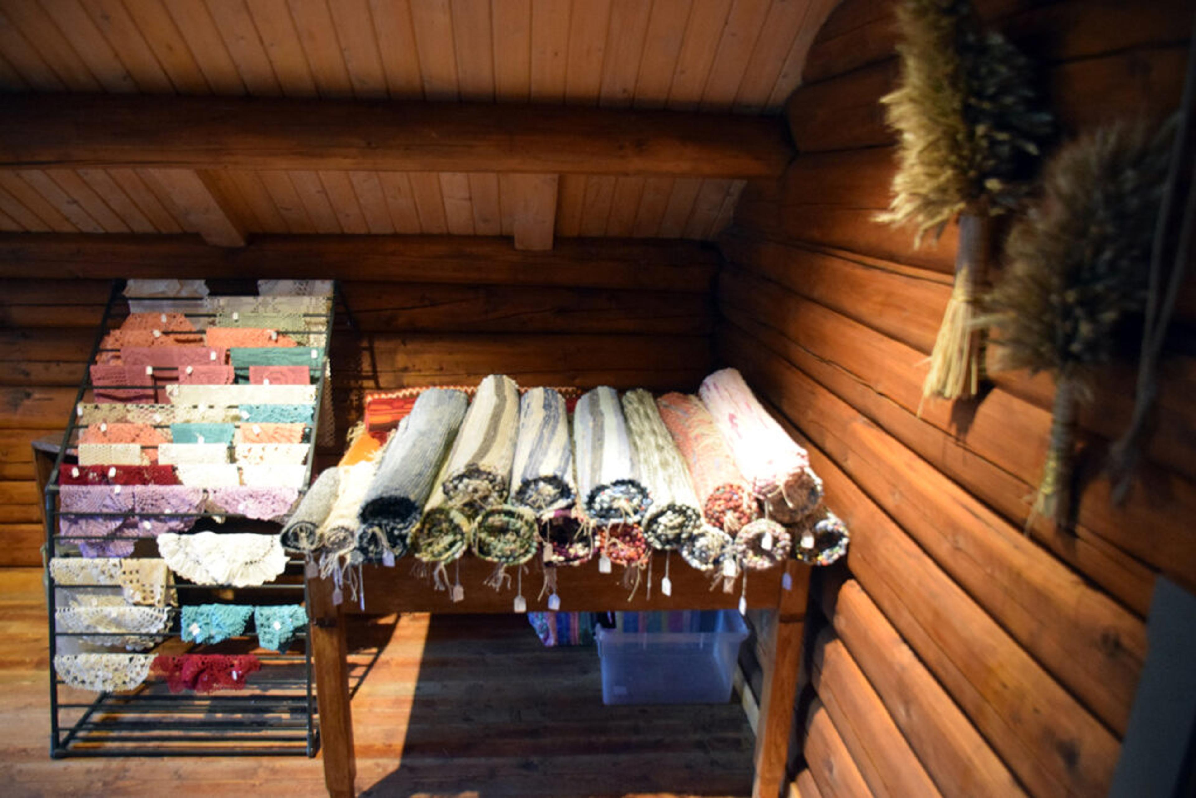 TEKSTILER: Mødrene har strikka, sydd og vevd. Nå selges det i gårdsbutikken. Foto: Stian Ormestad.