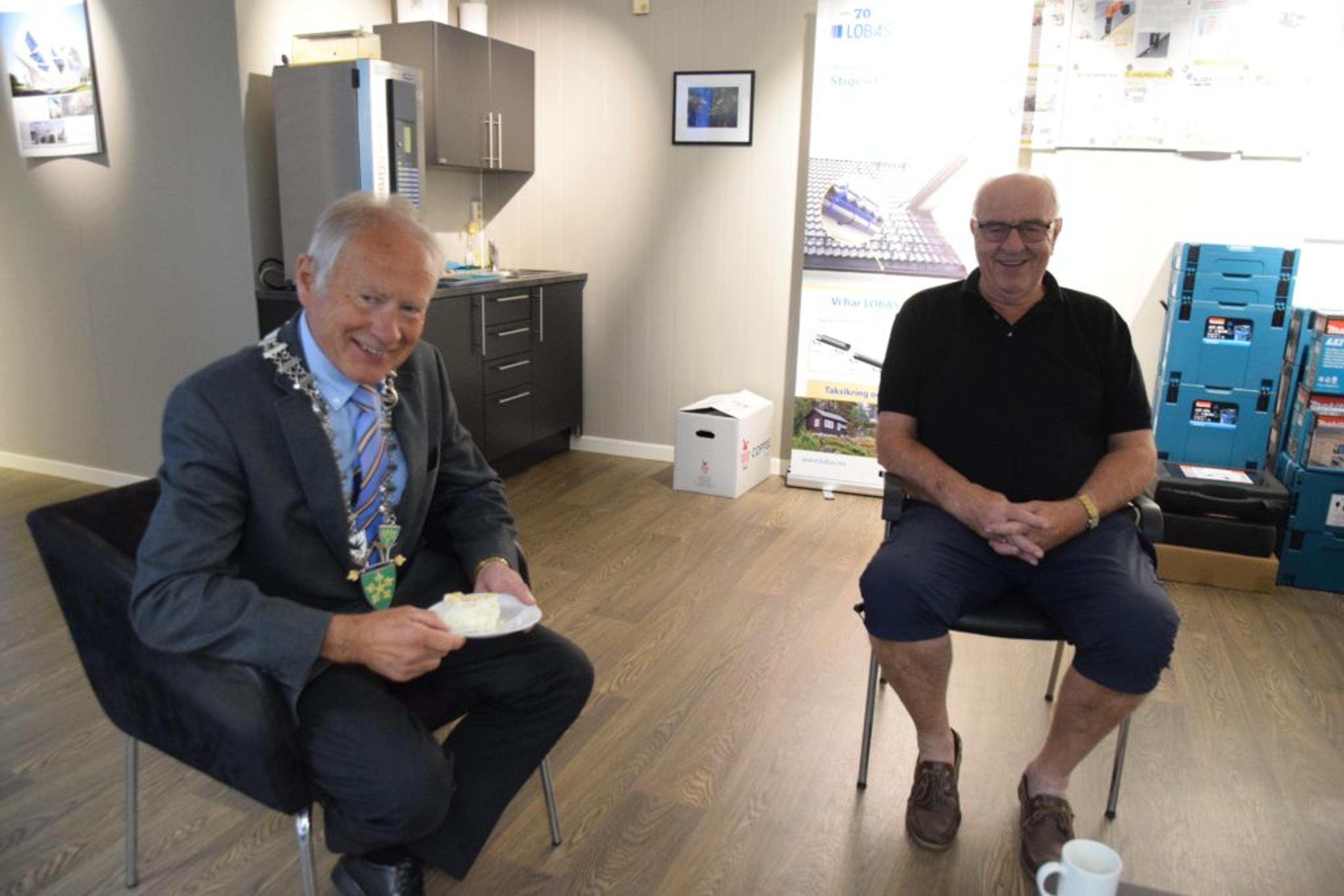 HØY MIMREFAKTOR: Ordfører Thorvald Hillestad og Stålprofil-grunnlegger Rolf Thorin hadde litt av hvert å mimre om da overrekkelsen ble feira med kaffe og kake. Foto: Stian Ormestad.
