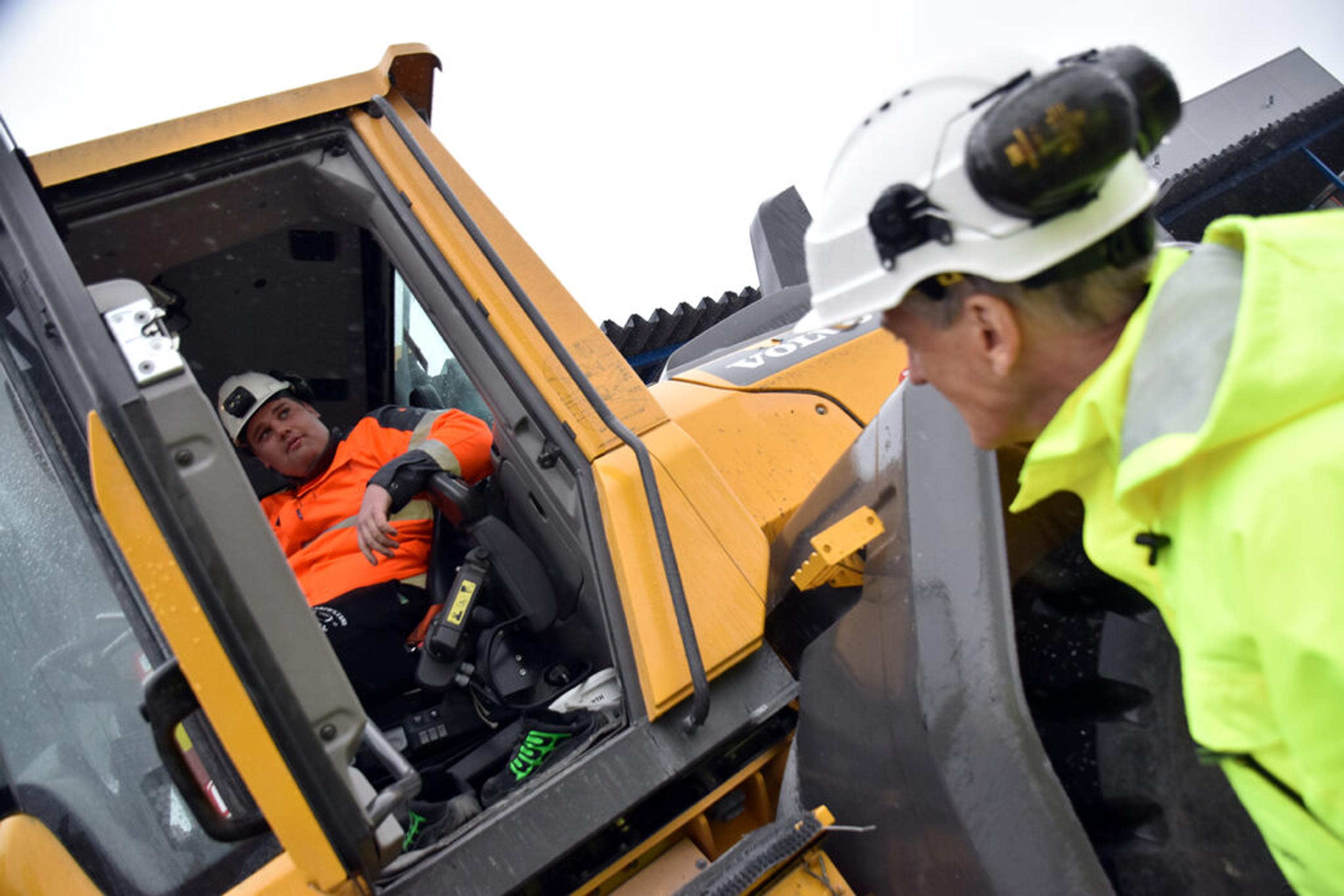 TOBIAS OG STATSMINISTEREN: 24-åringen sleit med å komme seg inn i arbeidslivet, men har nå finni seg godt til rette i hjullasteren. Statsminister Jonas Gahr Støre heier på Tobias og alle andre som kommer seg i jobb tross en litt trøblete start, forteller han til ReAvisa. Foto: Stian Ormestad, ReAvisa.