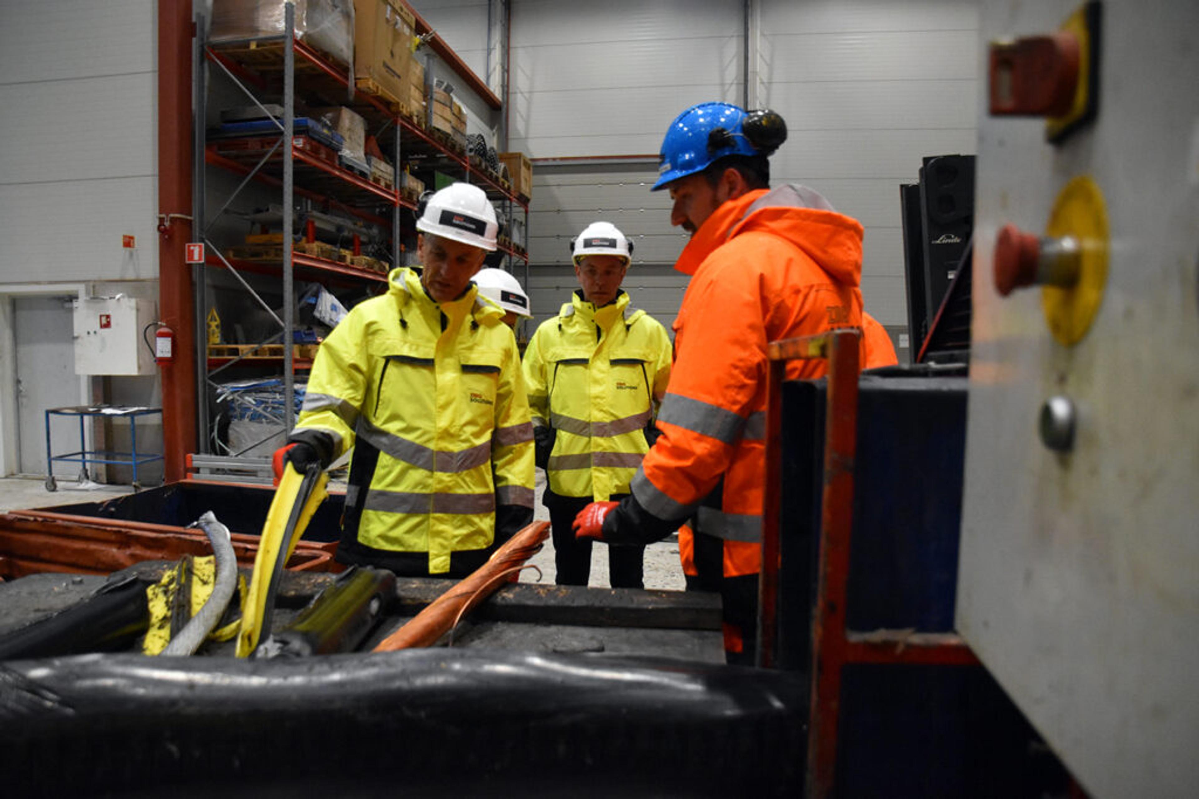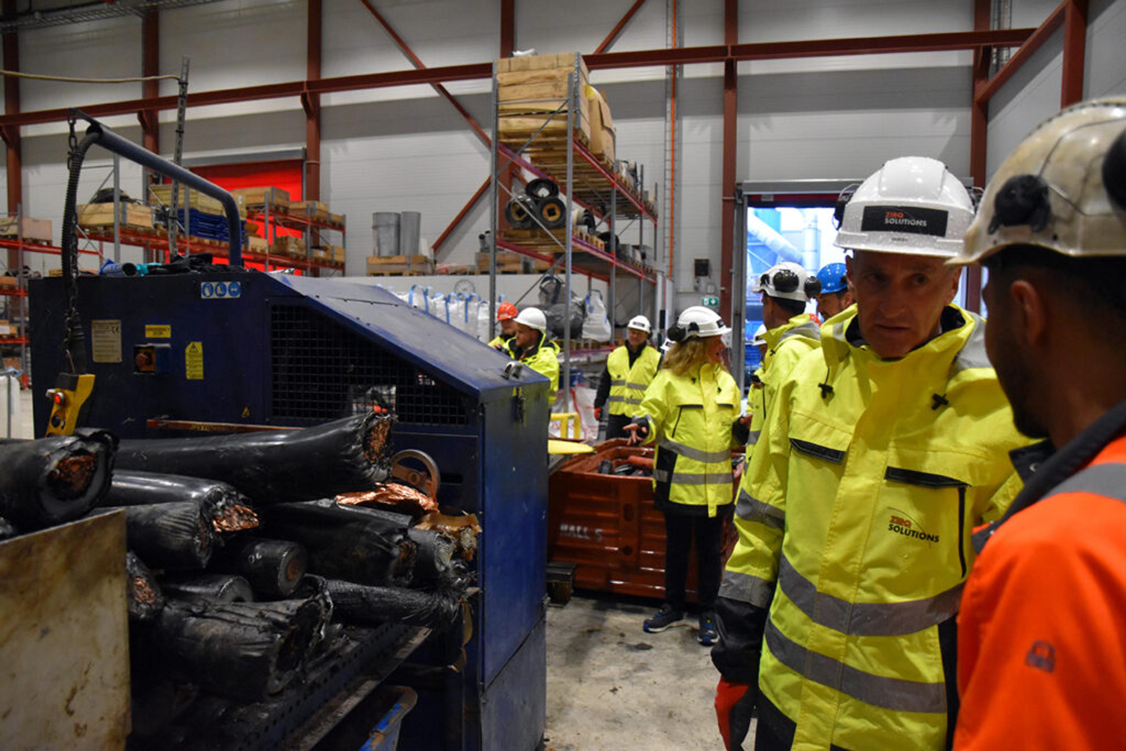 STATSMINISTER PÅ RE-BESØK: Hos Zirq Cables AS, tidligere KMT Gjenvinning AS, på Linnestad næringsområde. Re-bedriften fyller ti år i år. Foto: Stian Ormestad, ReAvisa.