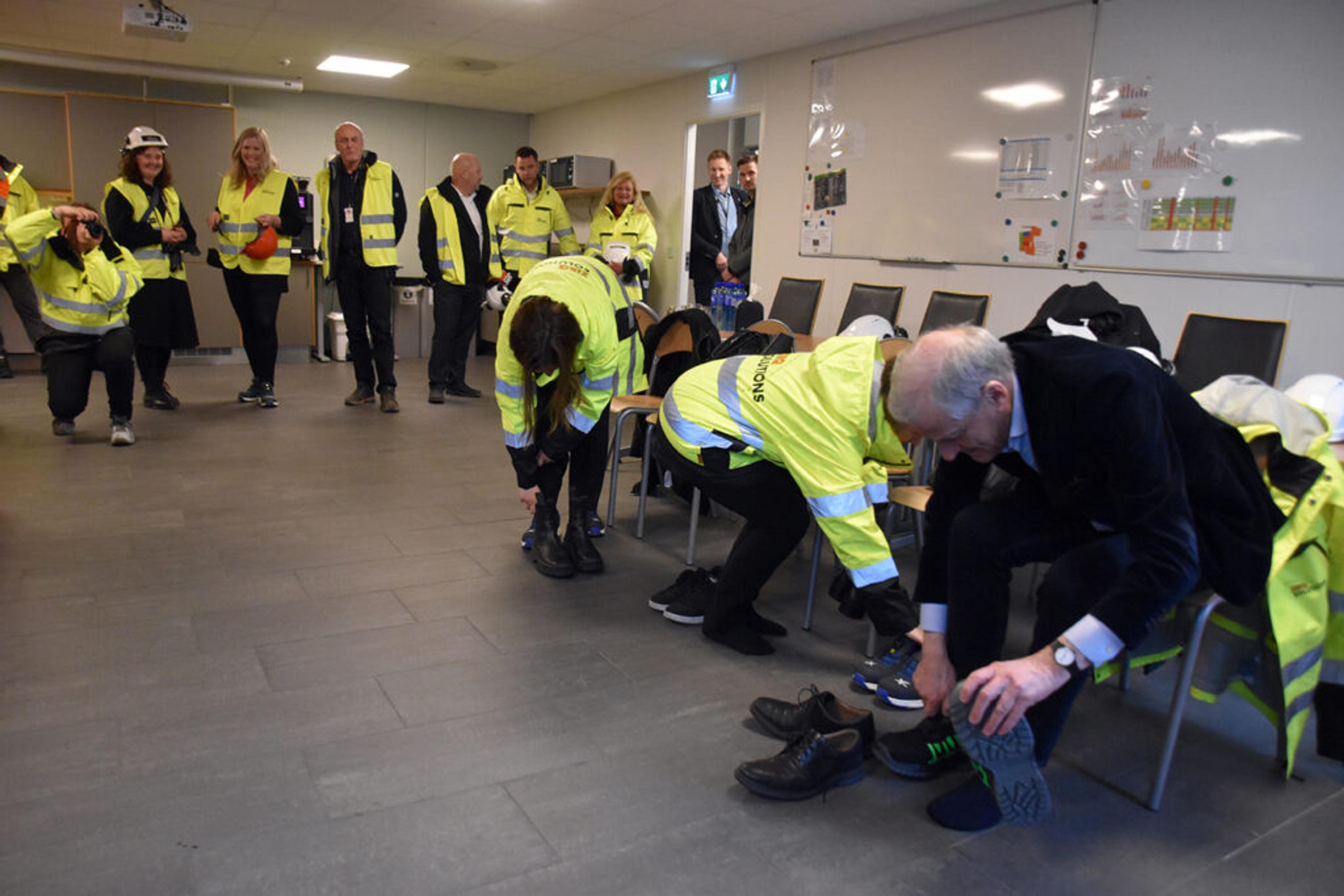 PÅKLEDNINGSKURS: – Hei alle! Nå skal dere få se hvordan en statsminister kler på seg!, sier Jonas Gahr Støre til latter fra resten av gjengen på bedriftsbesøk i Re. Foto: Stian Ormestad, ReAvisa.