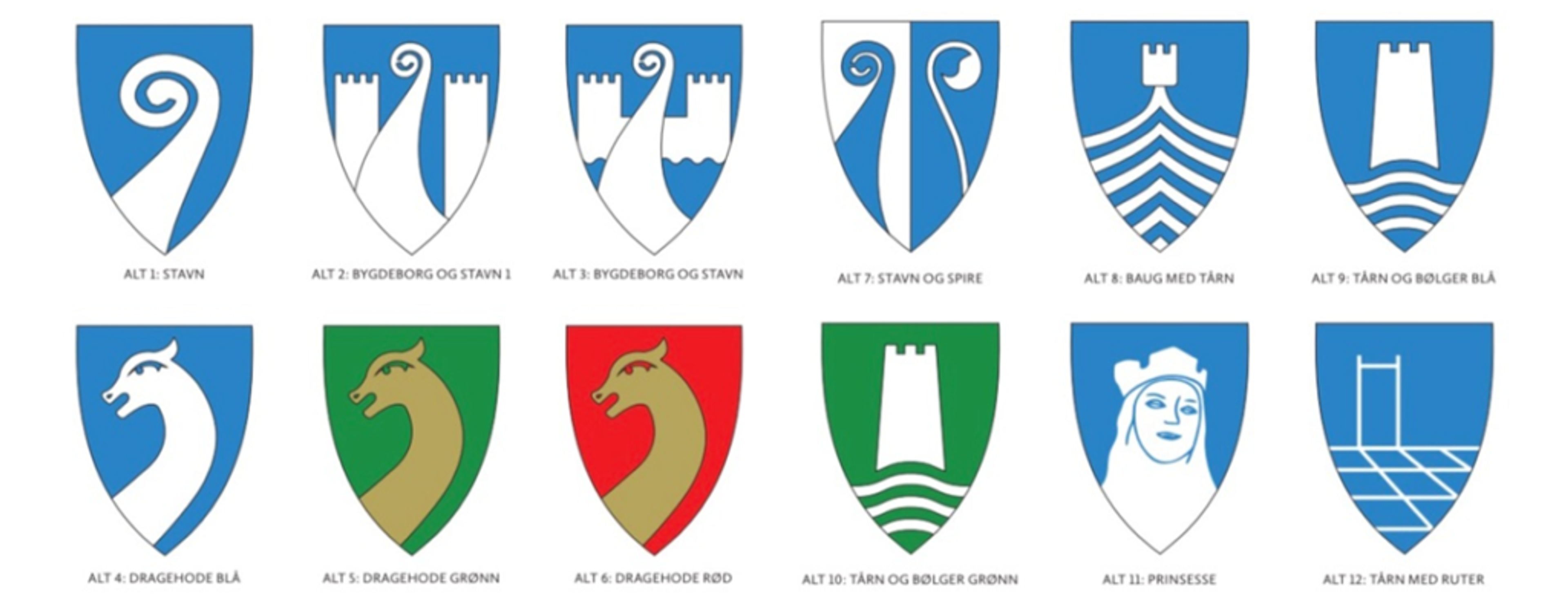 ALLE FINALISTENE: Nesten 150 forslag er blitt til 12 finalister. Helt på tampen av avstemningen slenger Re-ordføreren et justert forslag nummer 7 inn i kommunevåpen-kampen. Det rekker man ikke å legge inn i avstemningen. I avstemningen er det mulig å stemme for hvert av forslagene, men også å ikke velge noen av dem – altså stemme blankt. Illustrasjon: Nye Tønsberg kommune.