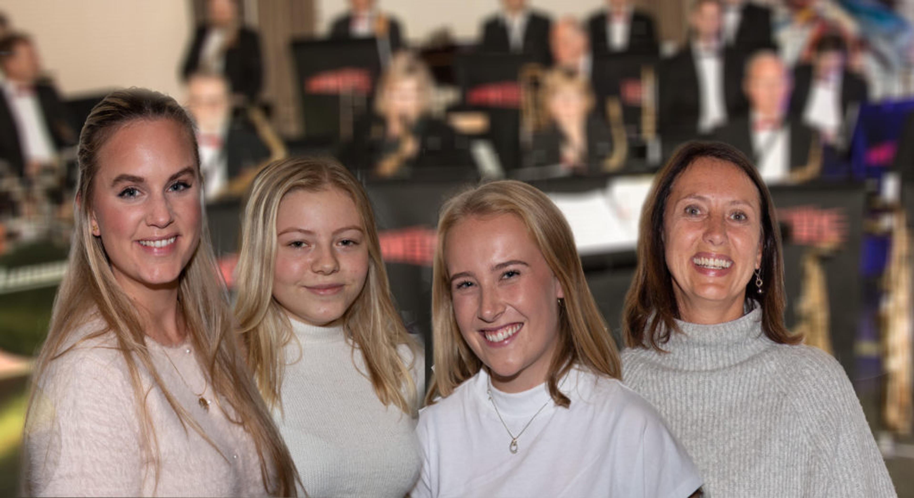 VOKALISTER: Line Knudsen (helt til høyre) får i år selskap av tre unge, lokale vokalister, som alle tre debuterer med storband: Martine Therese Tørum, Caroline Kirkevold og Ingrid Hagen. Foto: Pressemelding.