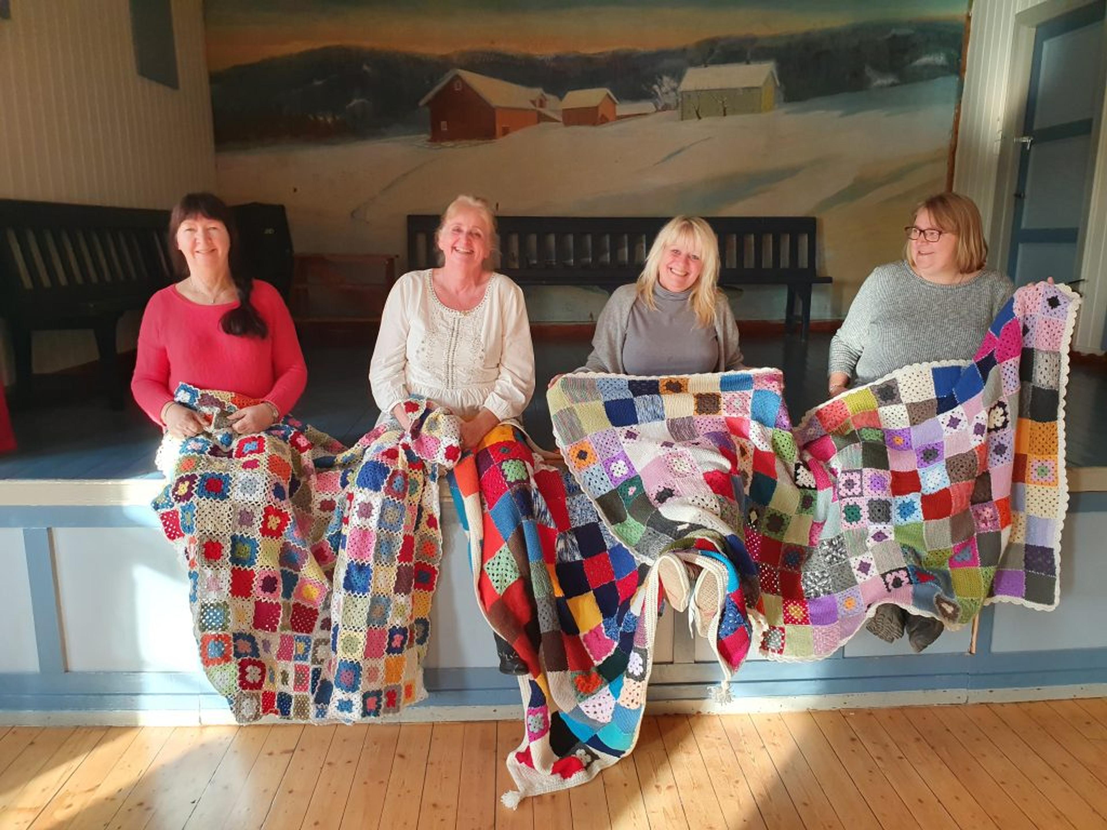STRIKKERE PÅ SVERRETUN: Fire av de glade strikkerne viser fram de tre store lappeteppene de har laga, fra venstre Solveig Gustavsen, Lise Linné, Anita Amundsen og Inger Johanne Gjersøe. Foto: Roar Venås.