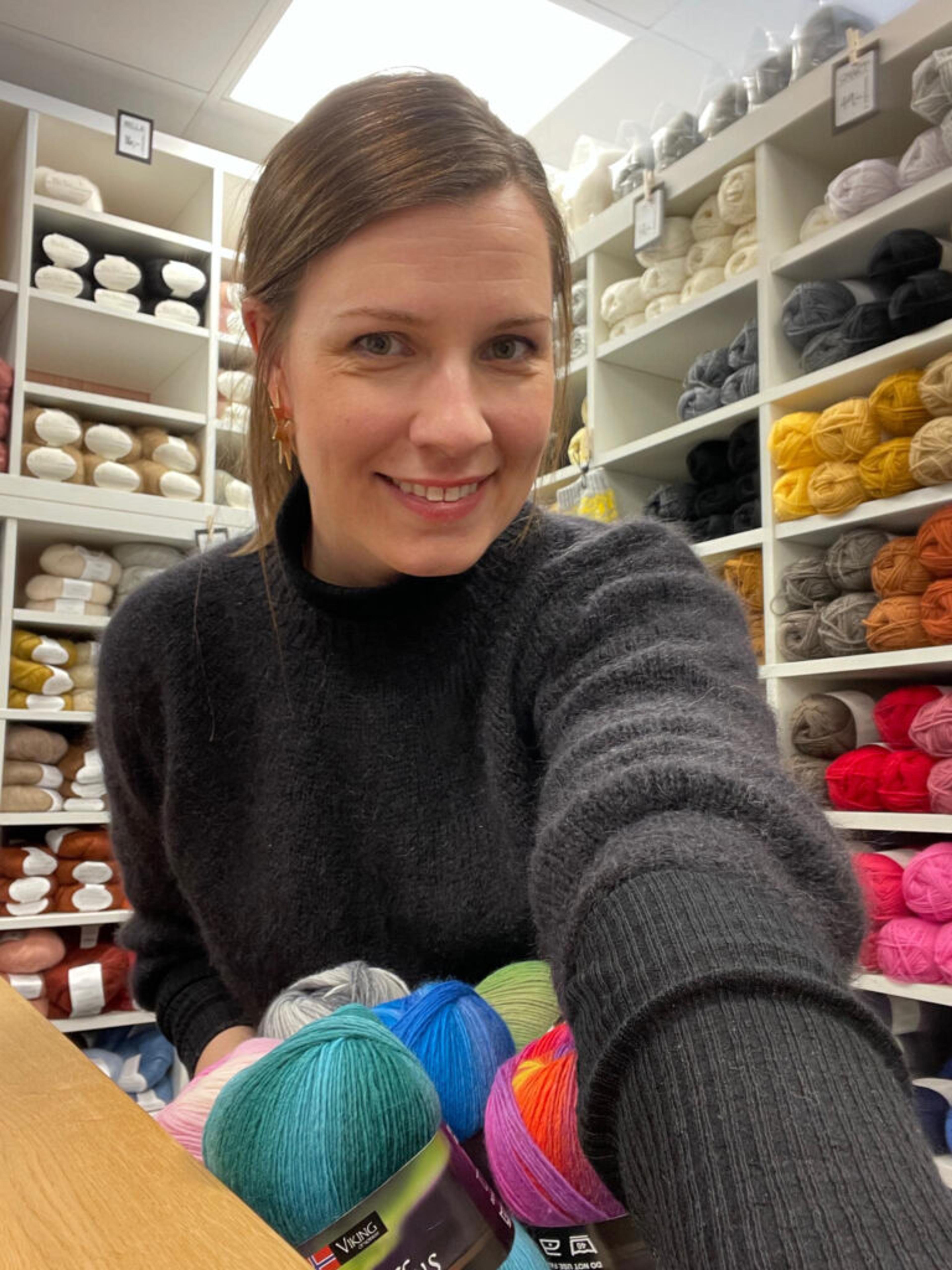 STRIKKEKLAR: Anje Verene, som eier og driver garnbutikken Keep Warm på Revetal, samarbeider med Restauranten om strikketapas den siste tirsdagen i de tre neste månedene mars, april og mai. Foto: Privat.