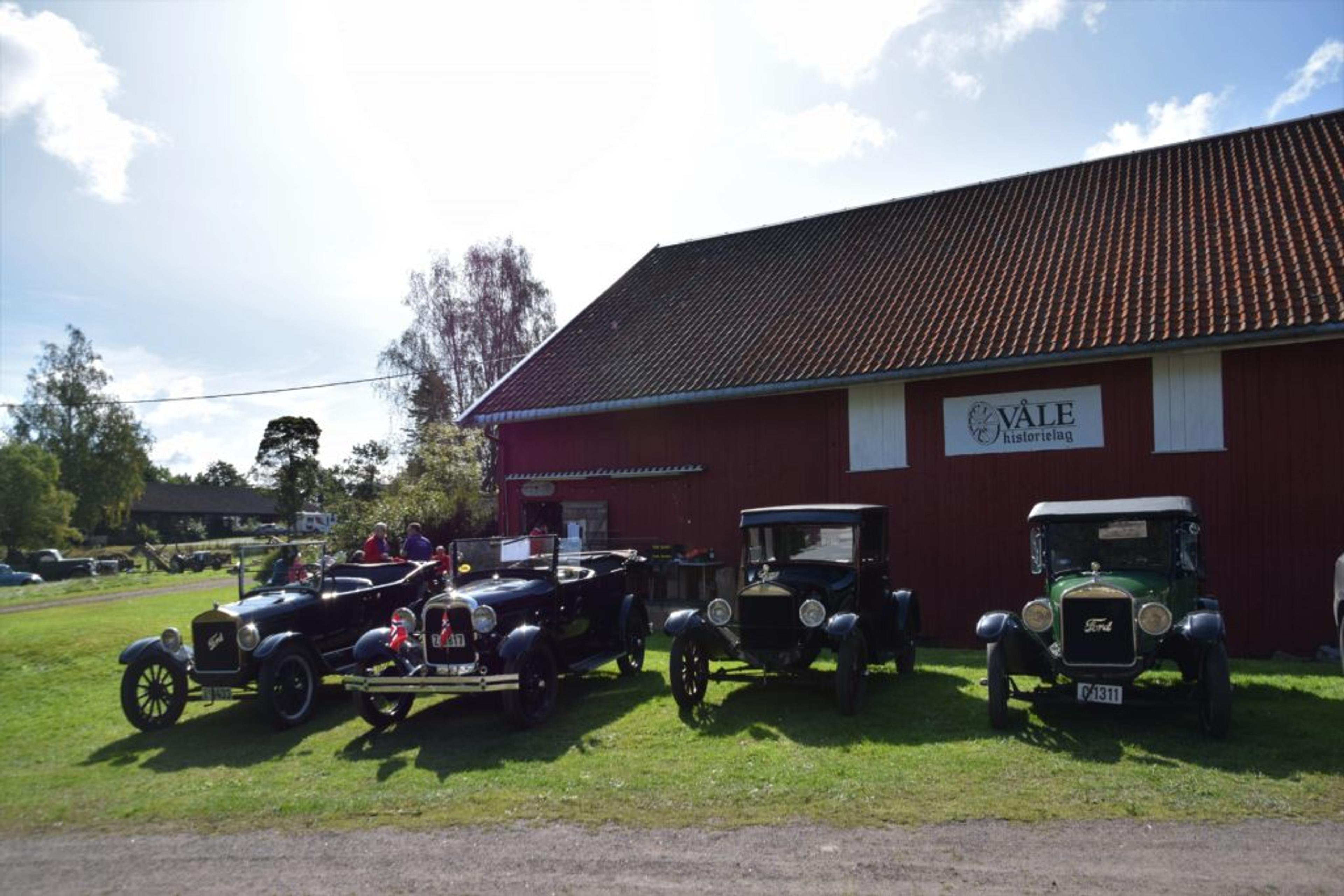 RIGGA OG KLART: Veteranbilene skinner i sola. Våle prestegård er klar for nok en dag med masse folk på Sensommerfestival. Foto: Stian Ormestad.