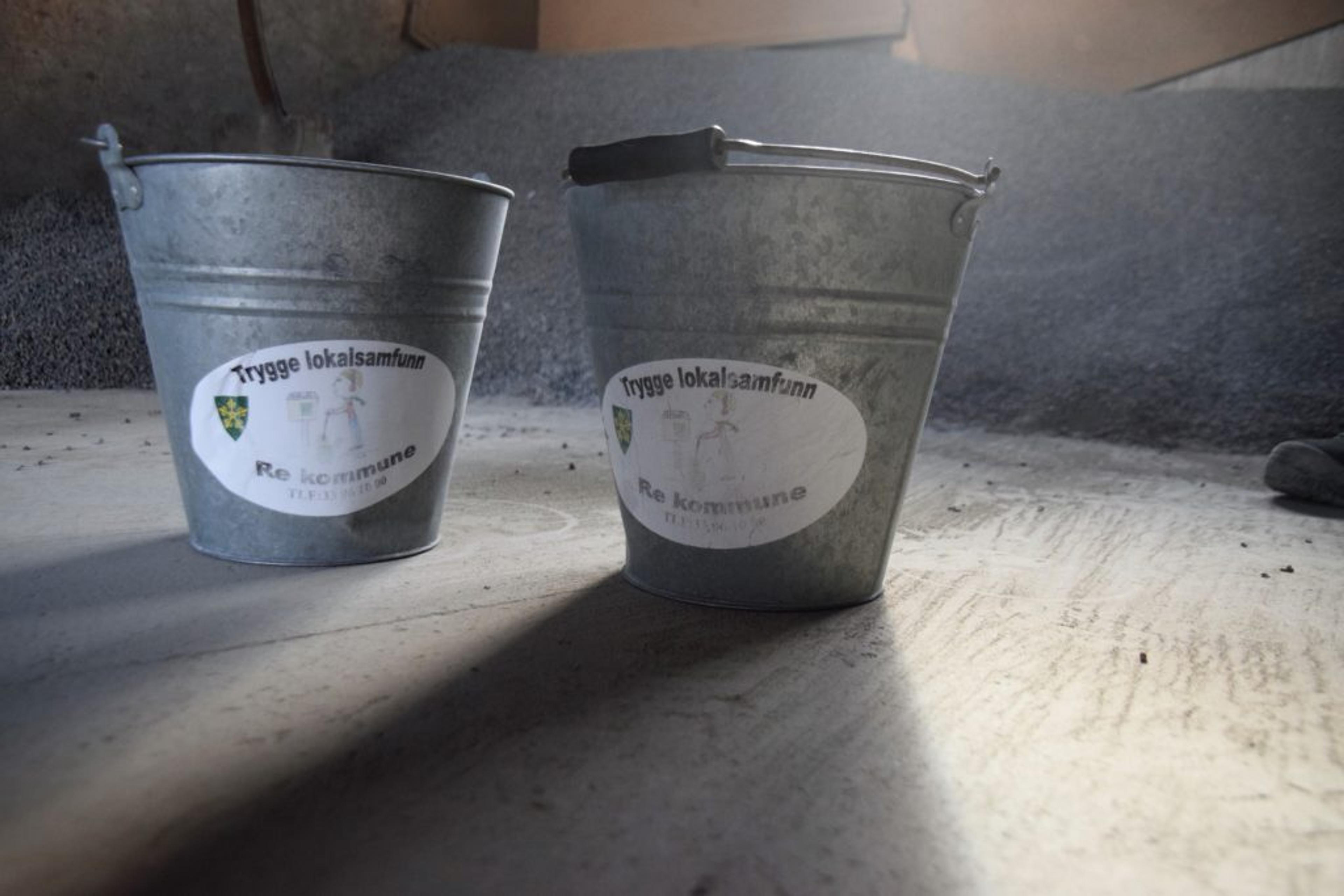 BIDRAR TIL ET TRYGGERE LOKALSAMFUNN: Tidligere fikk alle pensjonister i hele Re levert på døra, det vil si nesten 1.000 bøtter med strøsand og Re kommune-logo på. Foto: Stian Ormestad, ReAvisa.