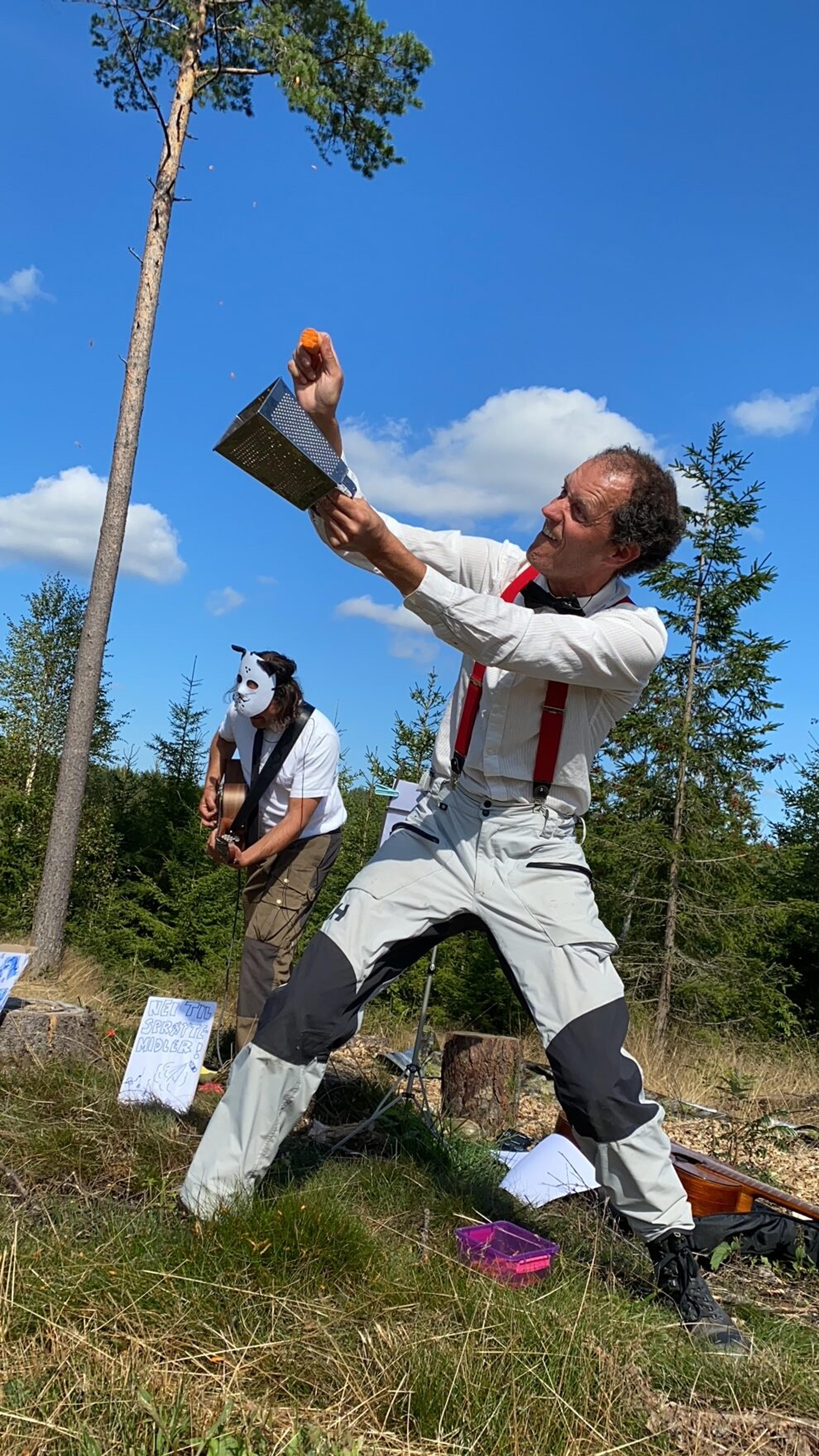 SHOW: Duoen Huskerikke med tidligere diakon i Re Ole Hafell på gitar i bakgrunnen og Tommy Taraldsvik i forgrunn med rivjern og gulrotkanon. Foto: Privat.