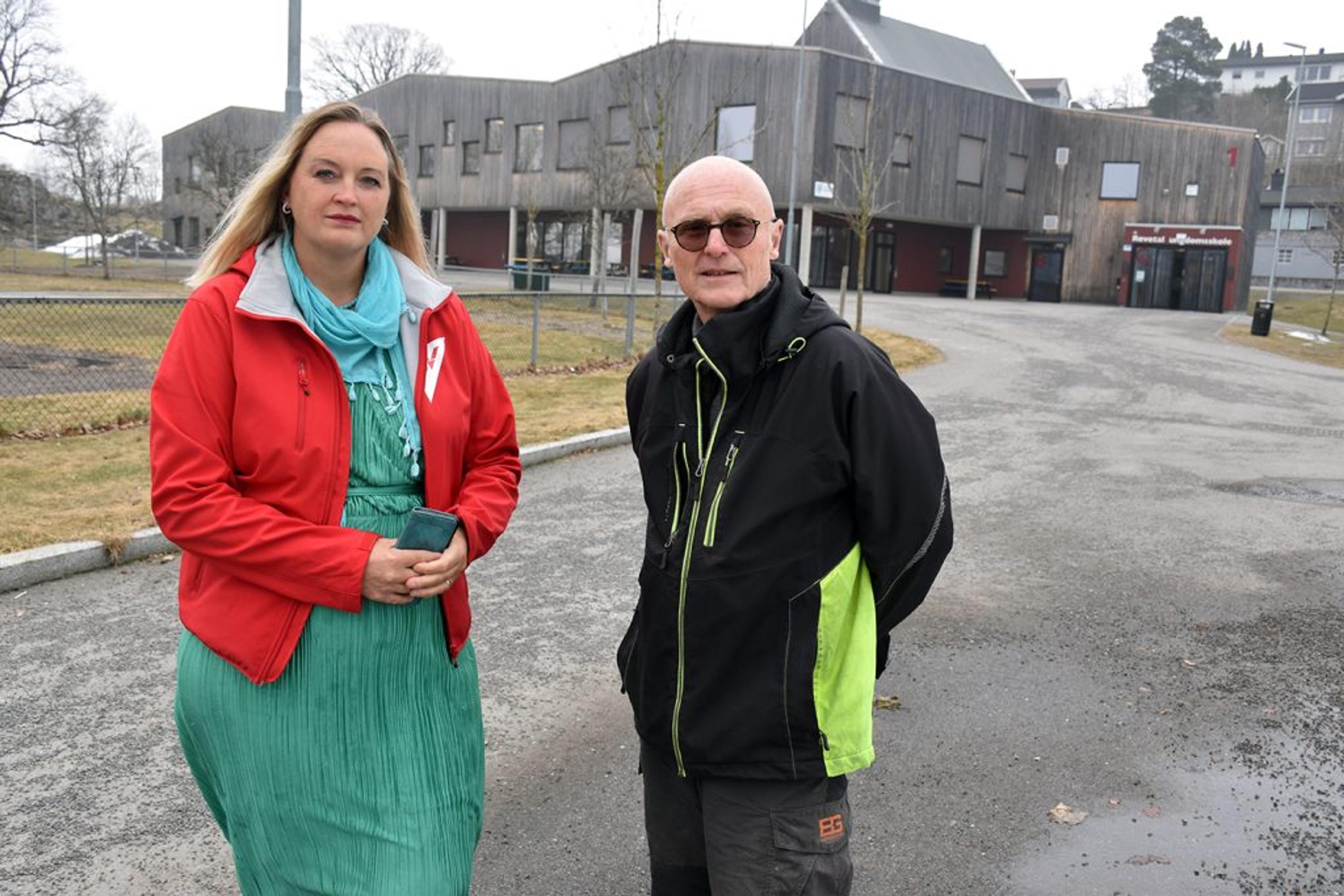 SV-duoen Christina Grefsrud-Halvorsen og Lars Egeland møter ReAvisa utafor Revetal ungdomsskole. Dette er et konkret eksempel på hva eiendomsskatt kan utrette, mener de:
