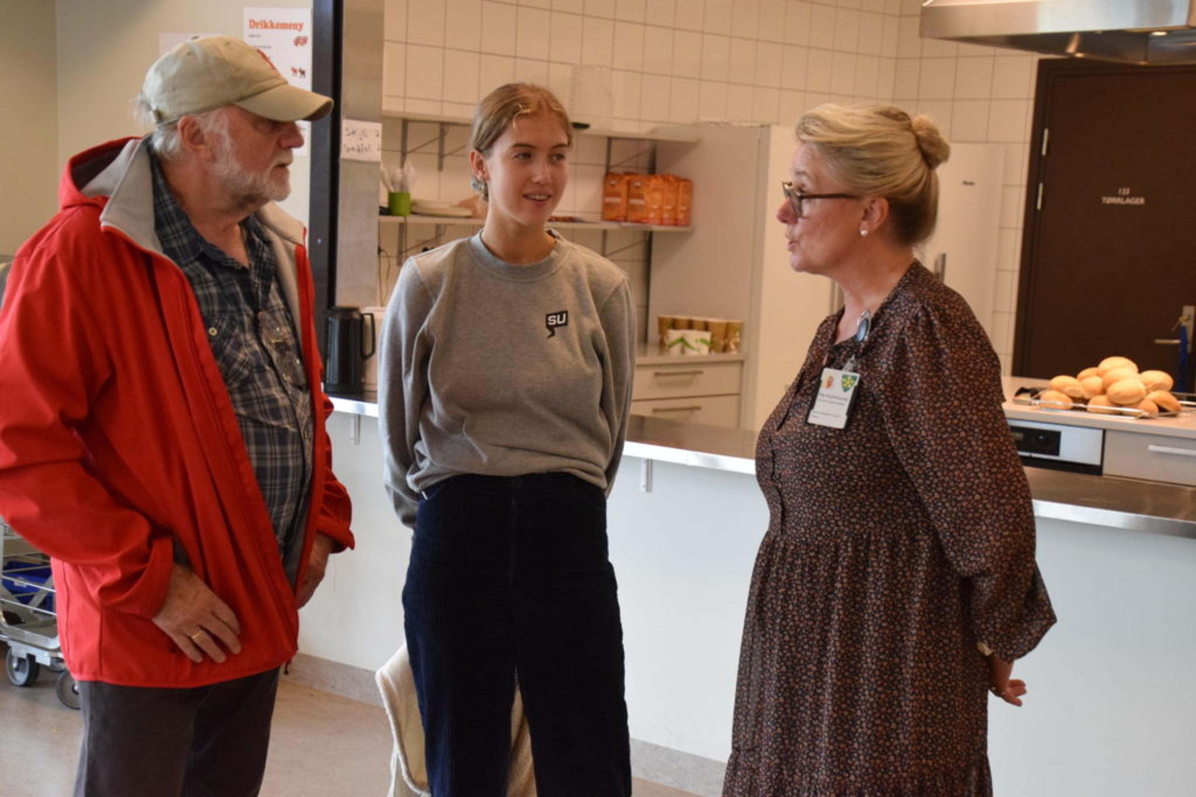 FROKOSTEN ER SERVERT: Fra venstre 3. kandidat for Tønsberg SV Heming Olaussen, 4. kandidat for Tønsberg SV Helene Viken, og Revetal ungdomsskole-rektor Mona Elisabeth Larsen. Foto: Stian Ormestad.