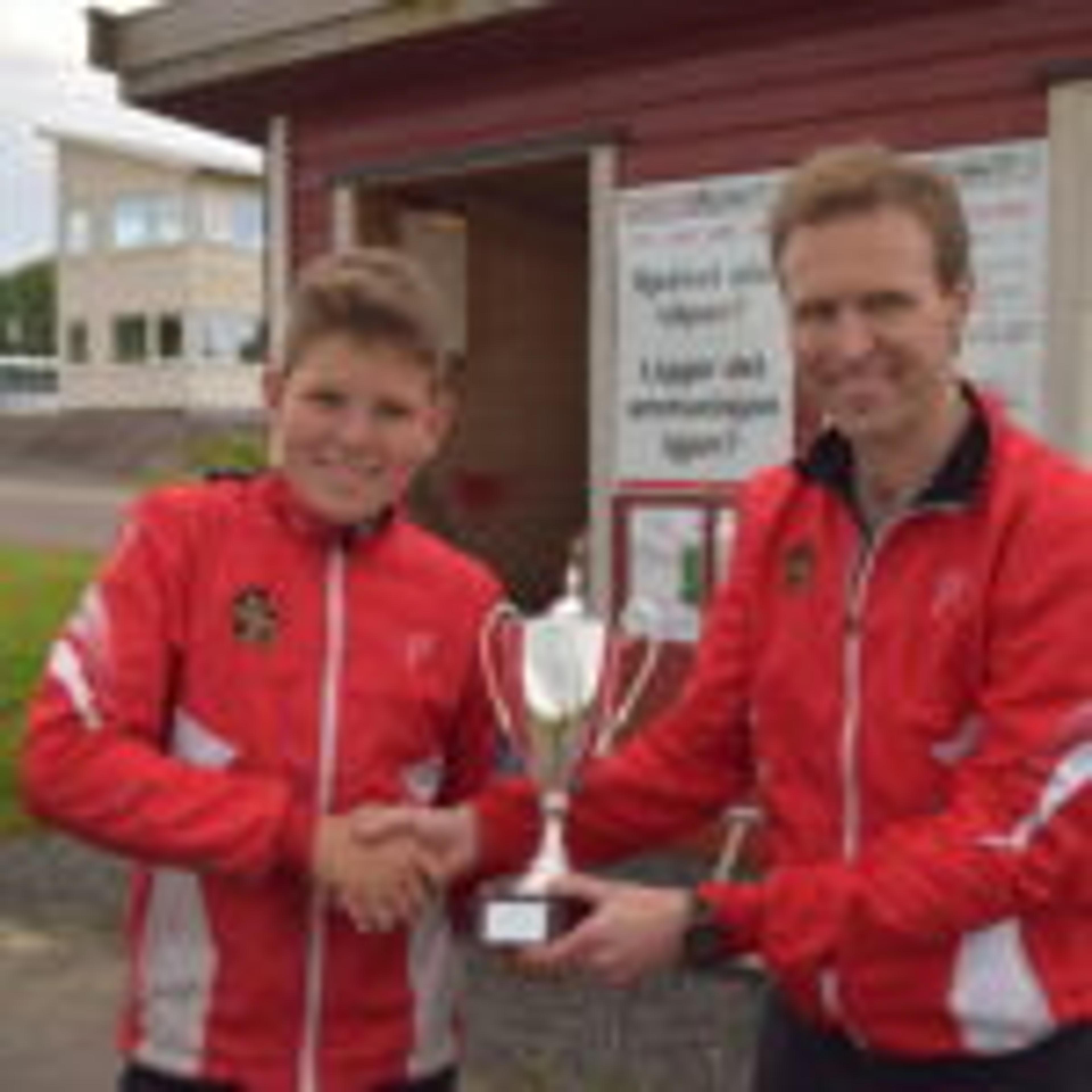 AKTIVT IVRIG-MEDLEM: Brødrene Grans Innsatspokal fikk Sebastian Horn av Thomas V. Langedrag for sin deltakelse i 31 renn på snø sist vinter. Foto: Håkon Westby.