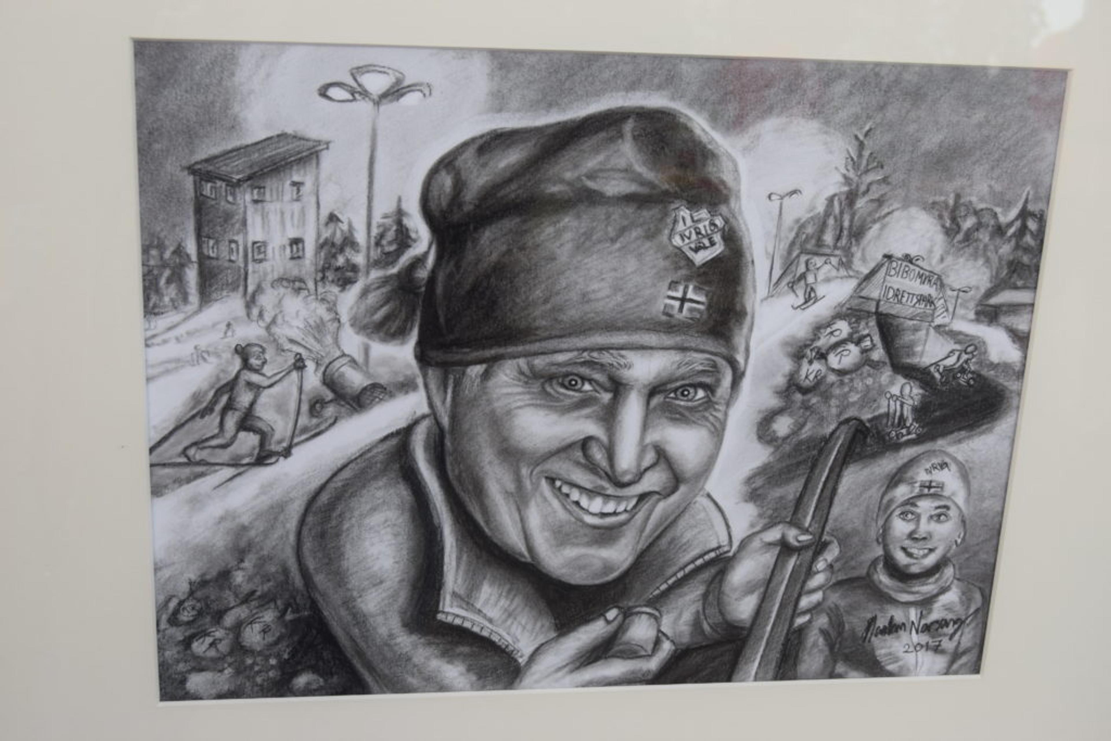 KARIKATUR I GLASS OG RAMME: Ikke vanskelig å kjenne igjen Ivrig-ildsjelen Svein Olsen (70) på denne tegningen av Haakon Norseng – også en aktiv Ivrig-løper. Foto: Håkon Westby.