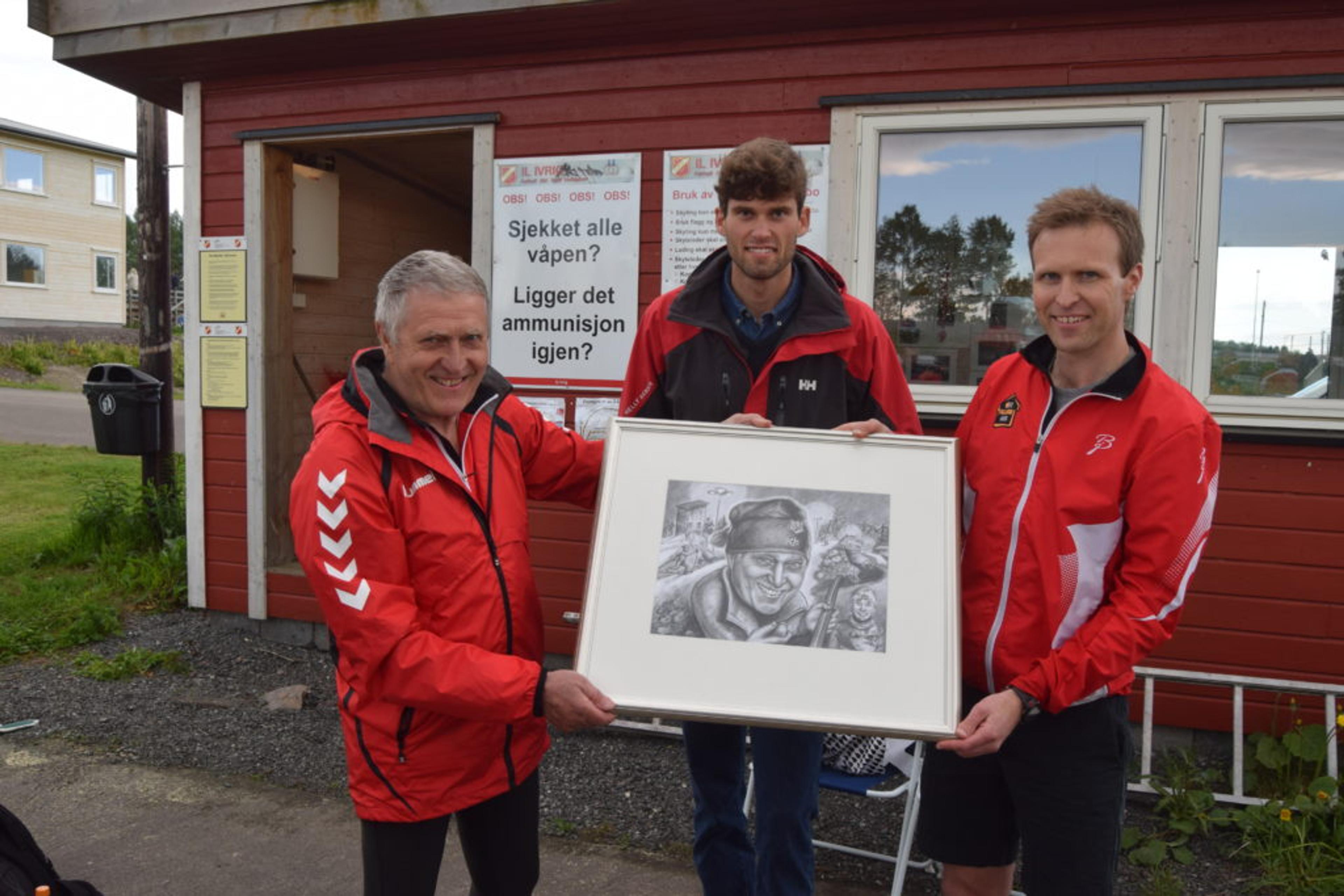 OVERREKKELSE: Svein Olsen, til venstre, med tegningen han fikk overrakt av Thomas V. Langedrag. Bak står kunstneren Haakon Norseng, som har laget den fine tegningen. Foto: Håkon Westby.