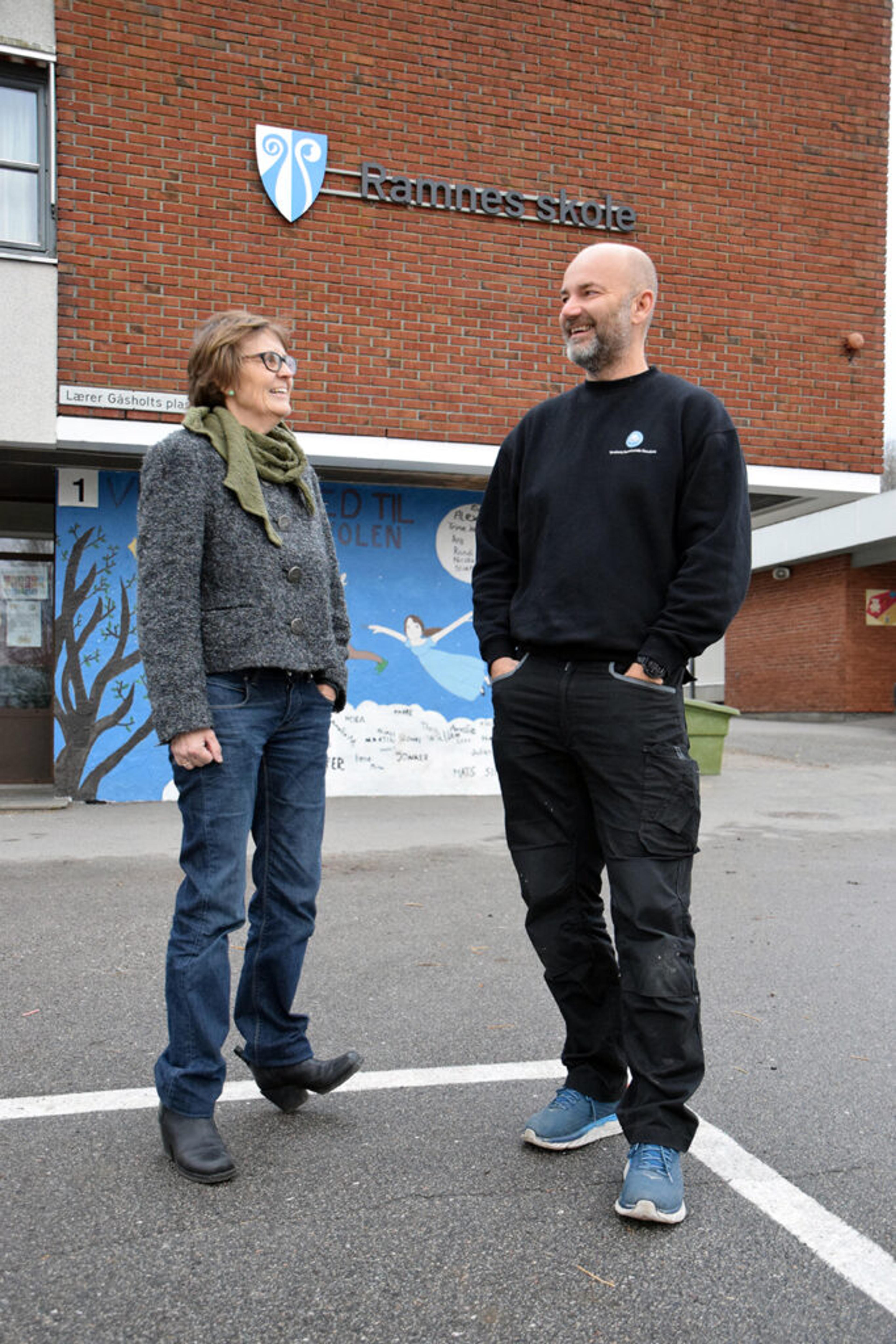 SKRYT: Mange skryter av Sven og vaktmester-jobben han gjør på Ramnes skole. Så også avtroppende Ramnes-rektor Kjellaug Lien, som forteller om et årelangt godt samarbeid. Foto: Stian Ormestad.