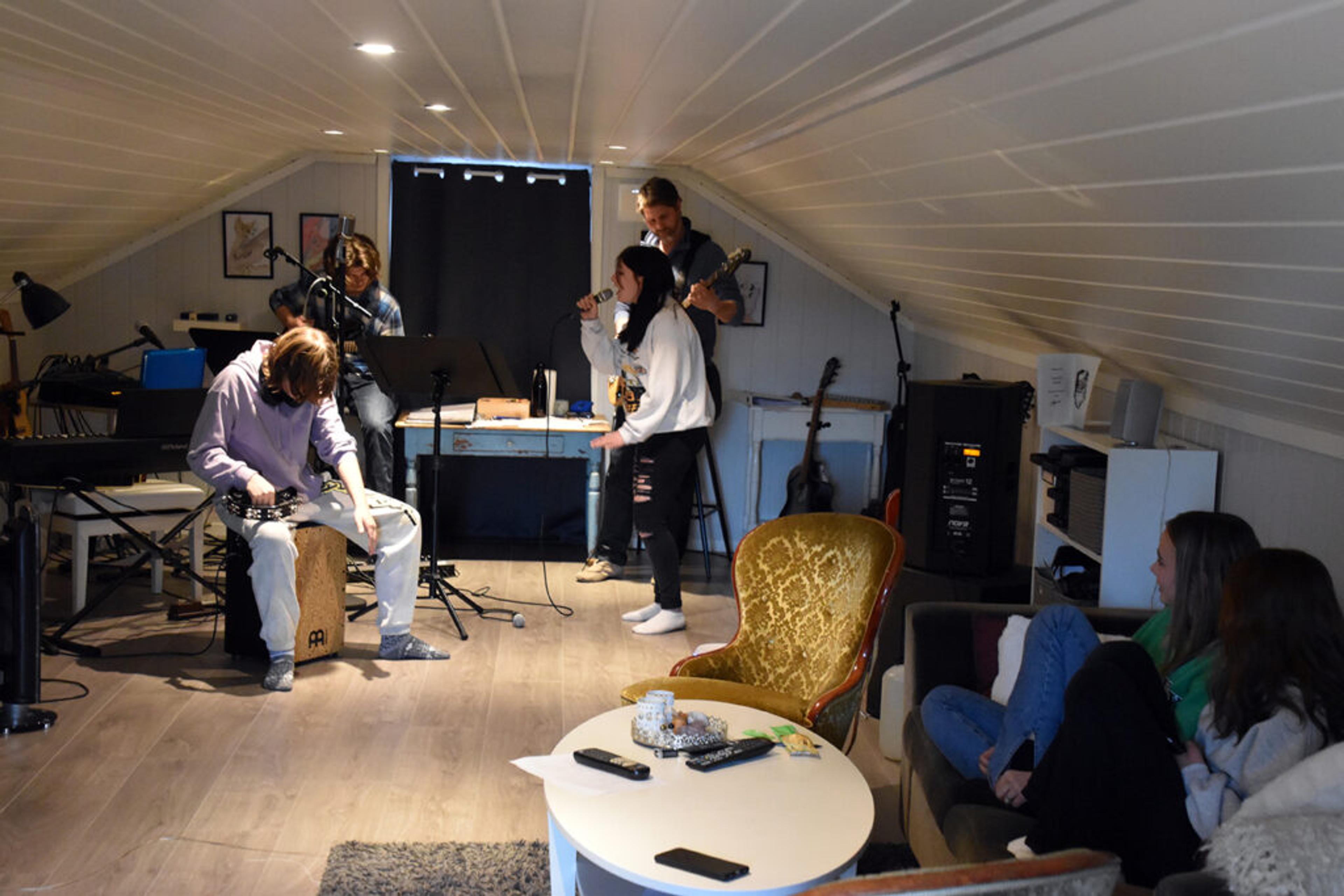 ØVINGSLOFTET: Thor-Morten bruker mye tid på å øve med de unge artistene i bygda vår, som får lov til å vise seg fram på stasjon-scenen hver vår og høst. Nå er konsertene endelig tilbake igjen etter korona! Foto: Stian Ormestad.