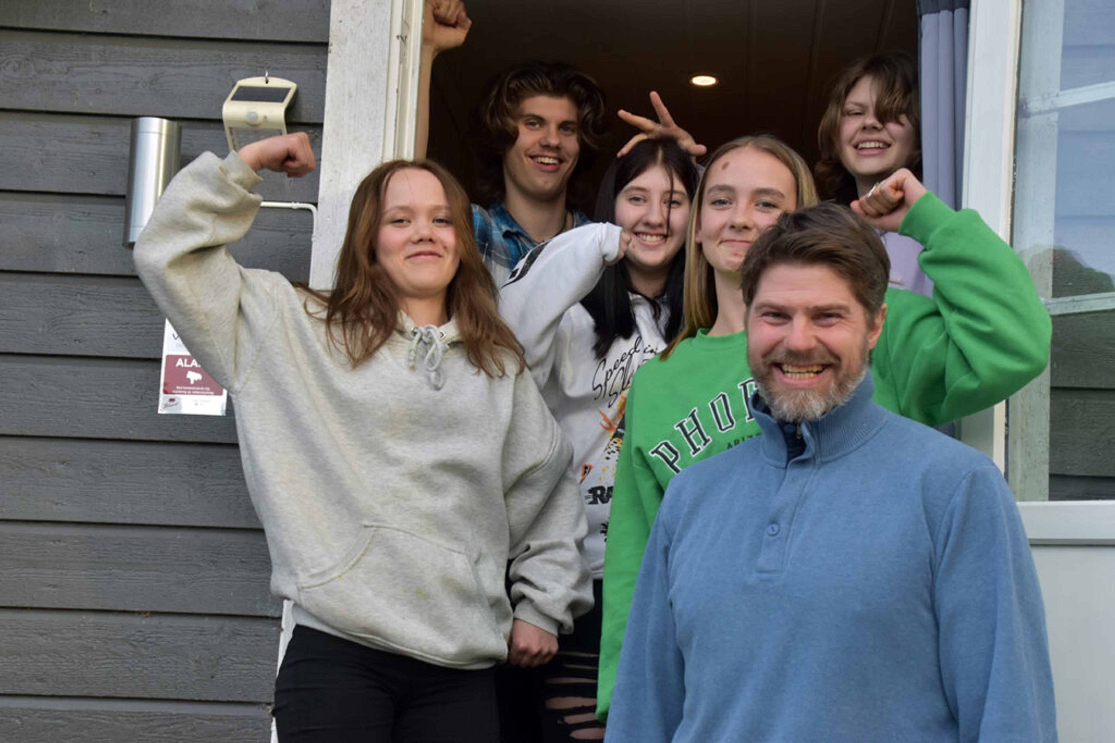 THOR-MORTEN OG GJENGEN: Røråstoppen-lærer Thor-Morten Hansen (46) øver med de unge lovende artistene i friminuttene, etter skoletid, og på kvelder og i helger på øvingsloftet over garasjen hjemme i Kileveien. Her ser vi ham sammen med Mathilde Skjeggestad (13), Natalie Jensen (14), Benedicte Brudvik (17), Håkon Haarseth-Hansen (17) og Hannah Haarseth-Hansen (14) som er klare for konsert fredag 1. april 2022. Foto: Stian Ormestad.