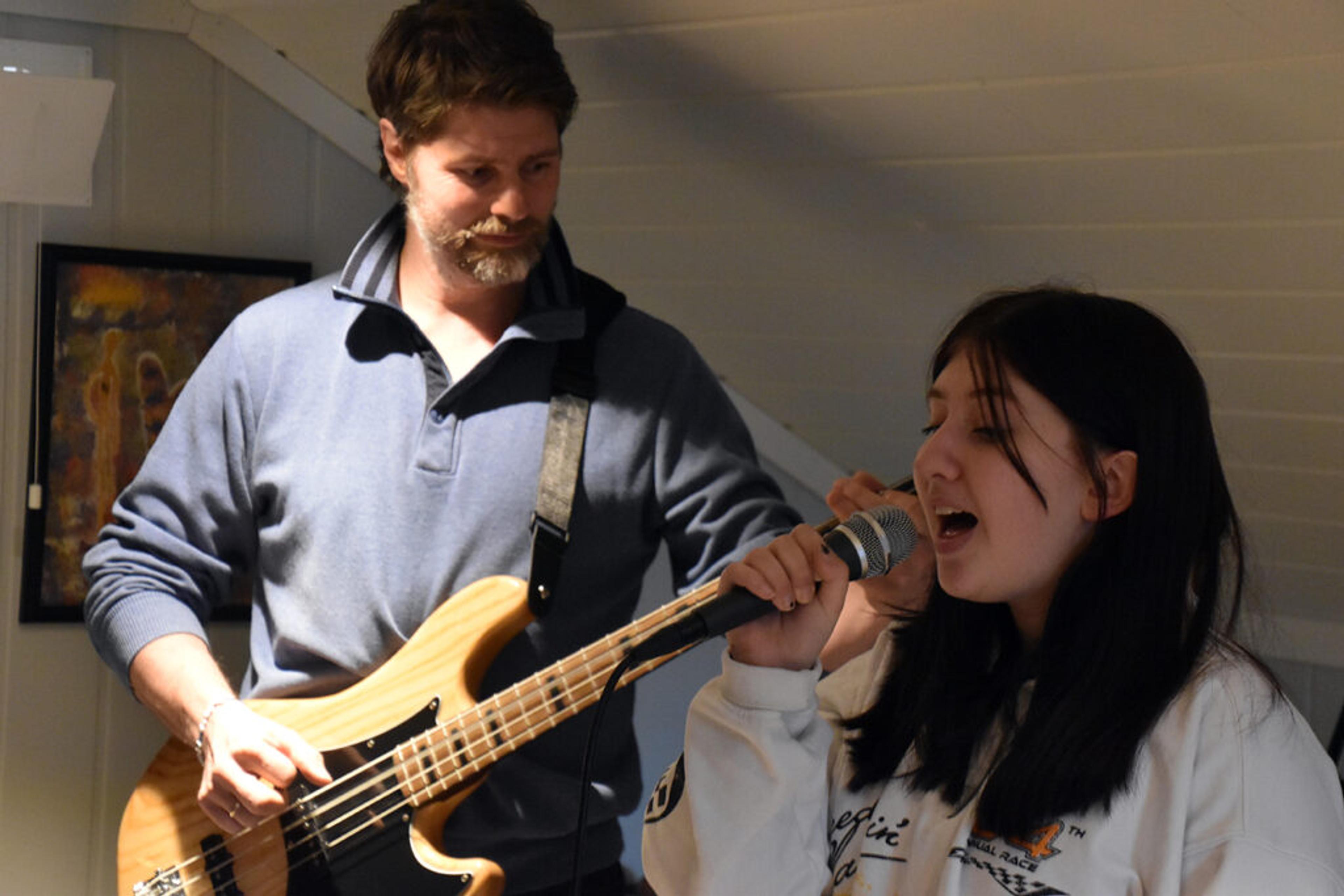 På konserten 1. april blir det hele 25 musikkinnslag. Natalie Jensen (14) og Mathilde Skjeggestad (13) på Revetal ungdomsskole skal synge sammen. Lokalavisa møtte dem på øving på øvingsloftet til Thor-Morten tidligere denne uka.