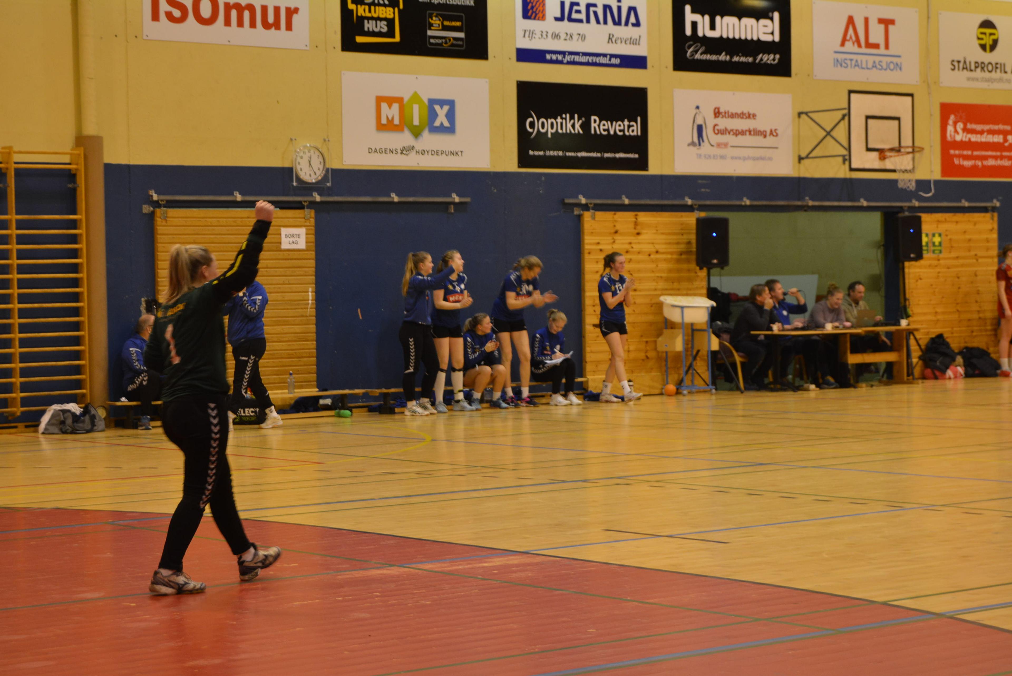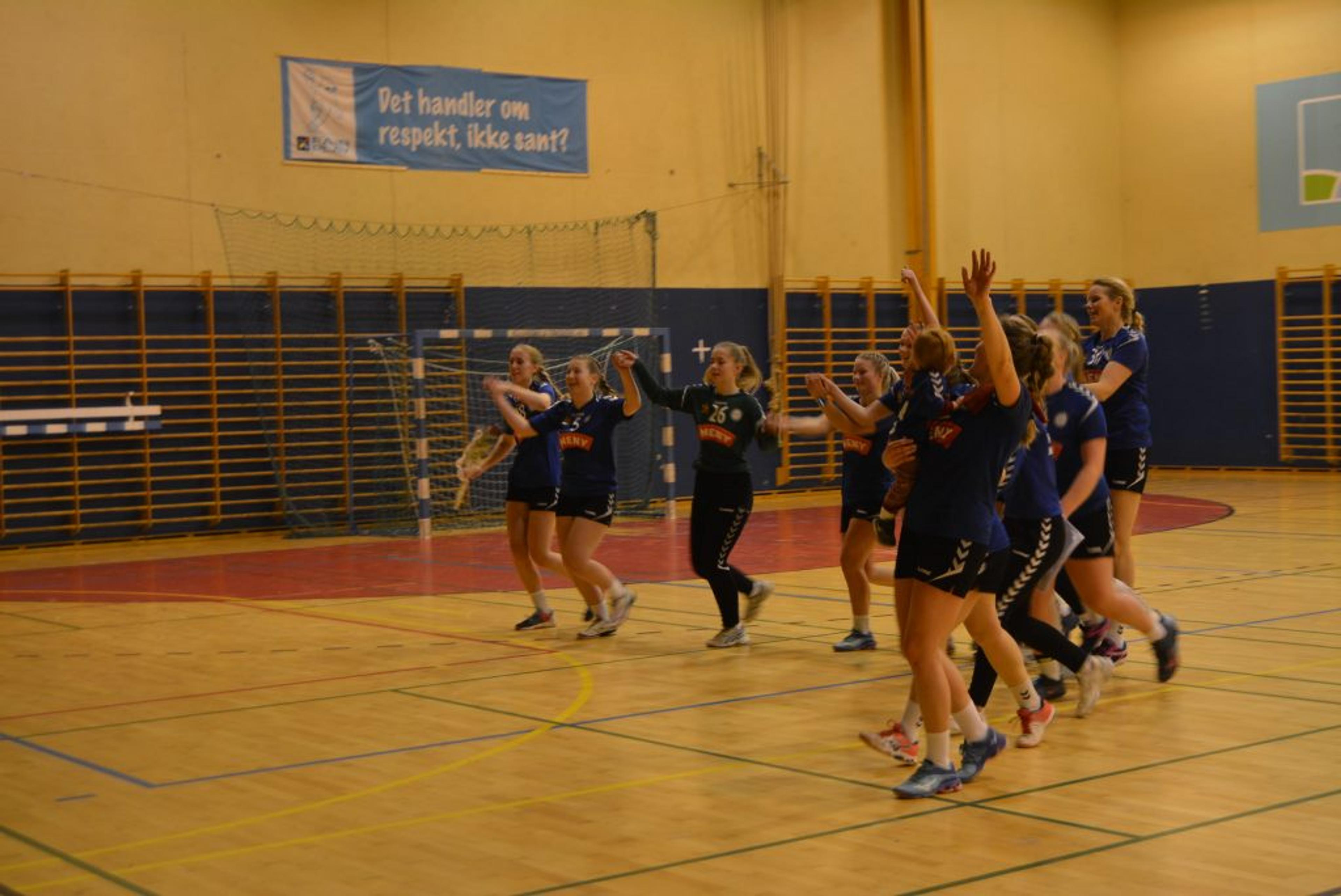 TAKKER TRIBUNEN: Ramnes-jentene hyller sitt trofaste hjemmepublikum i Ramneshallen. Foto: Lovis Eggum Wallberg.