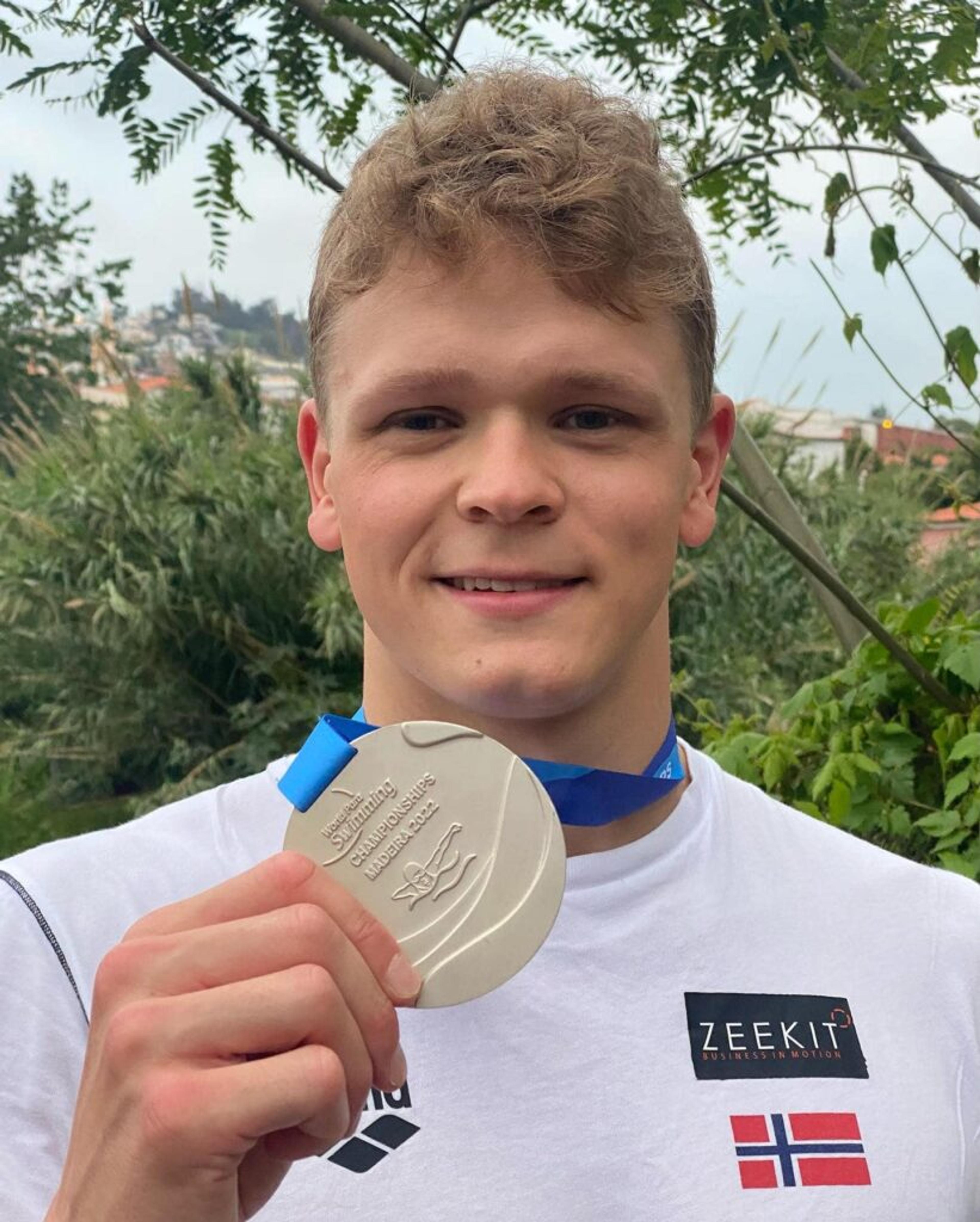 EDELT METALL: Det ble VM-sølv i Spania på Fredrik Solberg (20) fra Fossan. Foto: Norges Svømmeforbund.