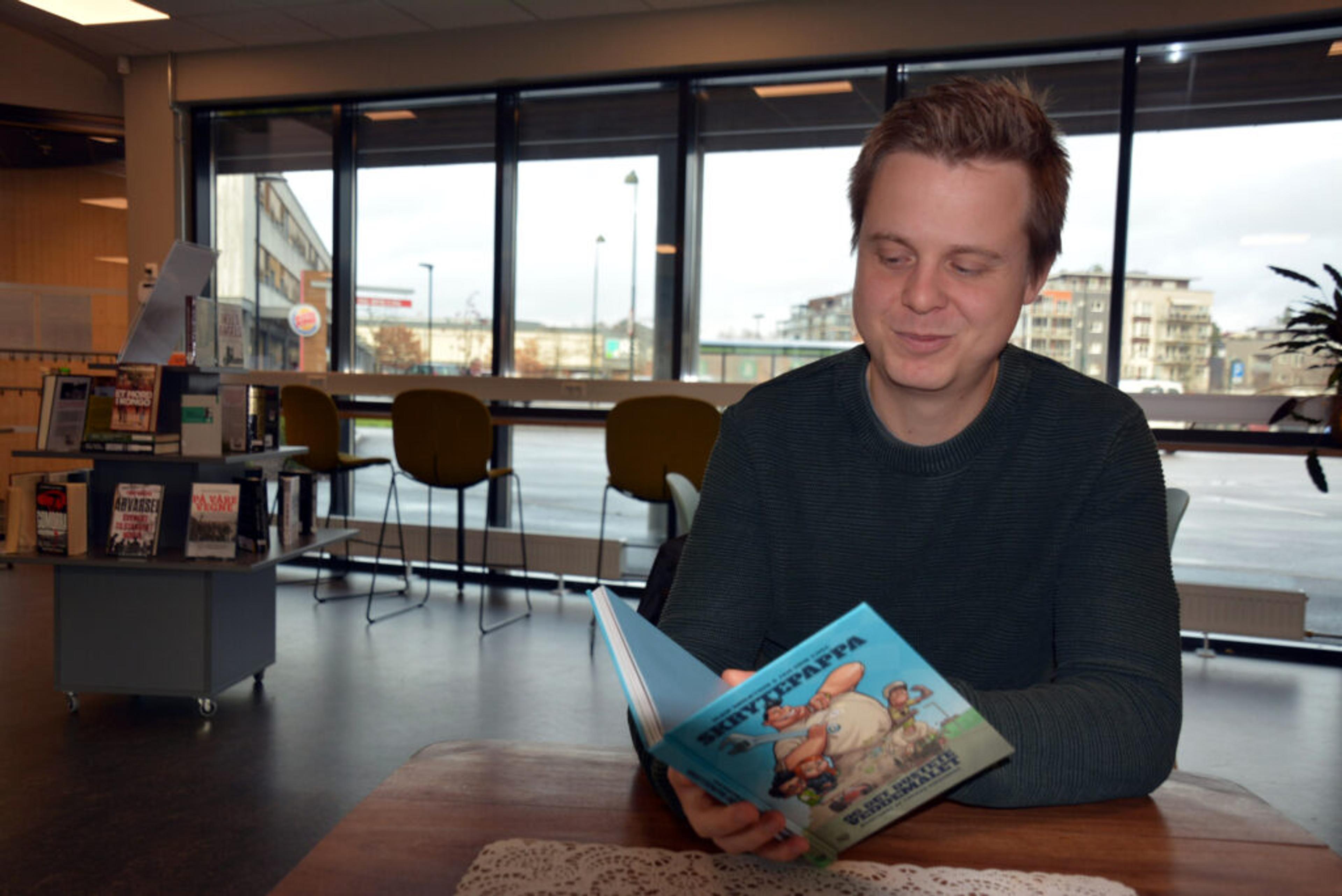 KREATIV KAR: Thomas Kirkeberg (33) fra Bergsåsen lever av å tegne og illustrere. Nå aktuell med den aller første boka i en ny barnebokserie: “Skrytepappa og det dustete veddemålet”. Pappa og en sleip nabo hisser hverandre opp før et stort olabilløp, og det ender med at barna må ordne opp i de voksnes bruduljer, uten å røpe for mye. Boka er ute nå, og den er å få kjøpt i bokhandelen på Re-torvet. Foto: Stian Ormestad.