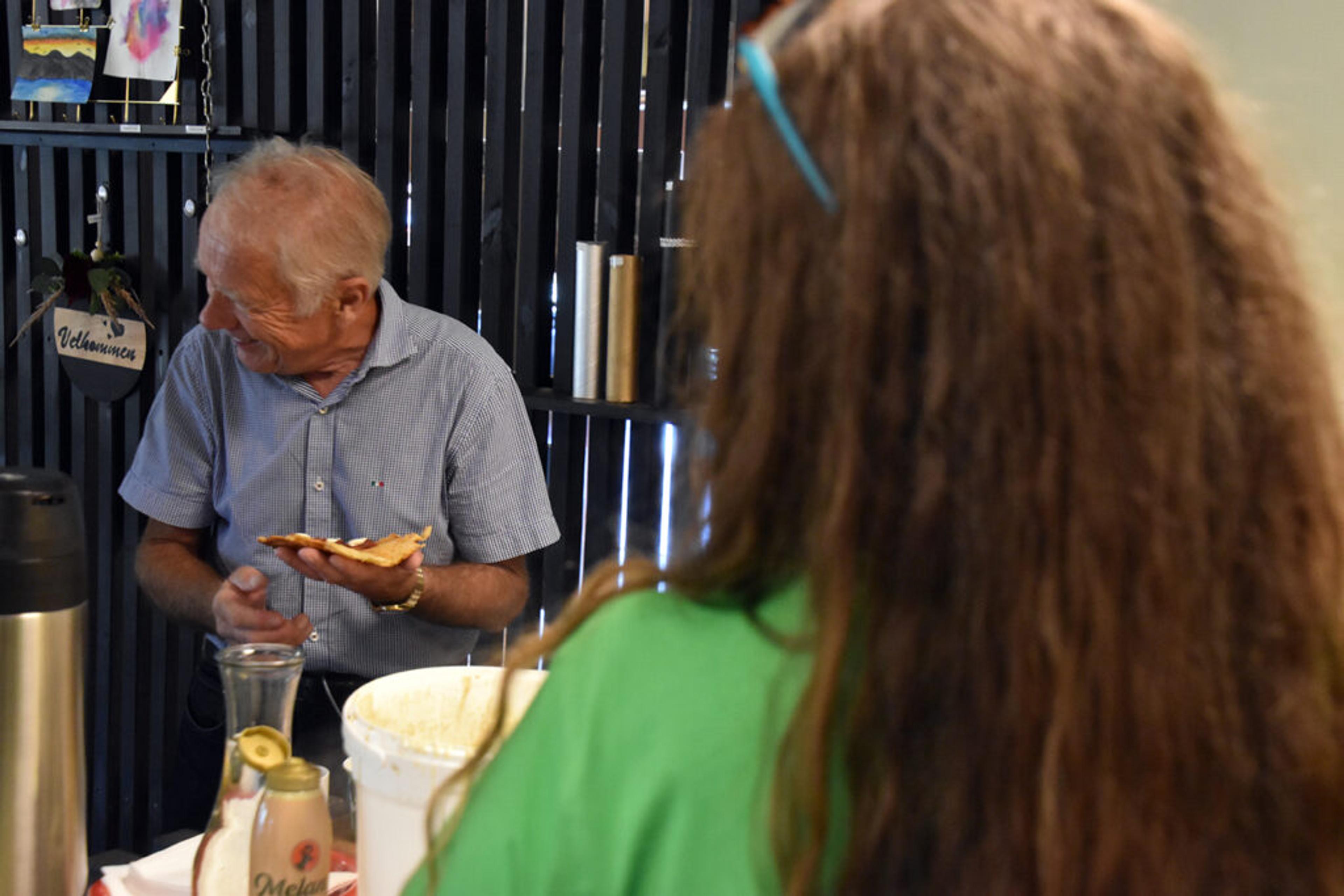 DEN SISTE VAFFEL? Det har blitt mange møter etter nesten 40 år som folkevalgt. Kanskje ble den siste møtevaffelen som folkevalgt fortært på tREffpunktet på Brår i dag. Thorvald Hillestad (71) mener det har vært viktig å møte folk, og ikke mure seg inne på et kontor. Foto: Stian Ormestad, ReAvisa.