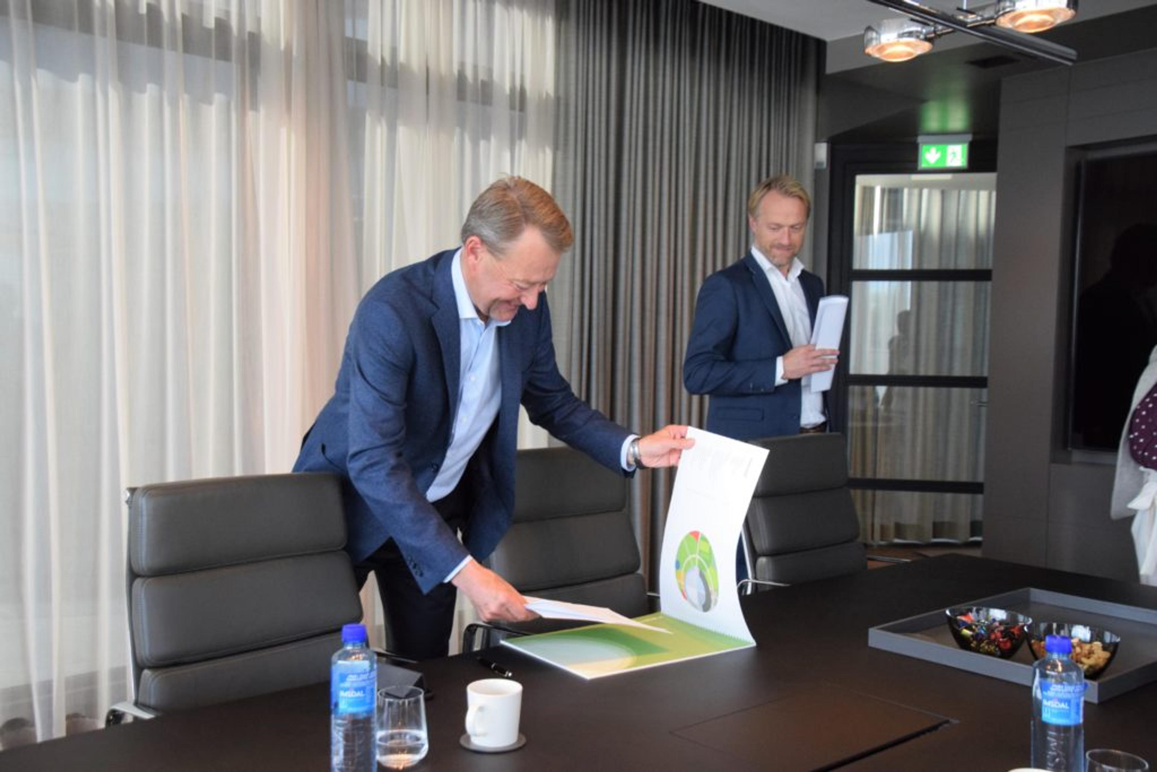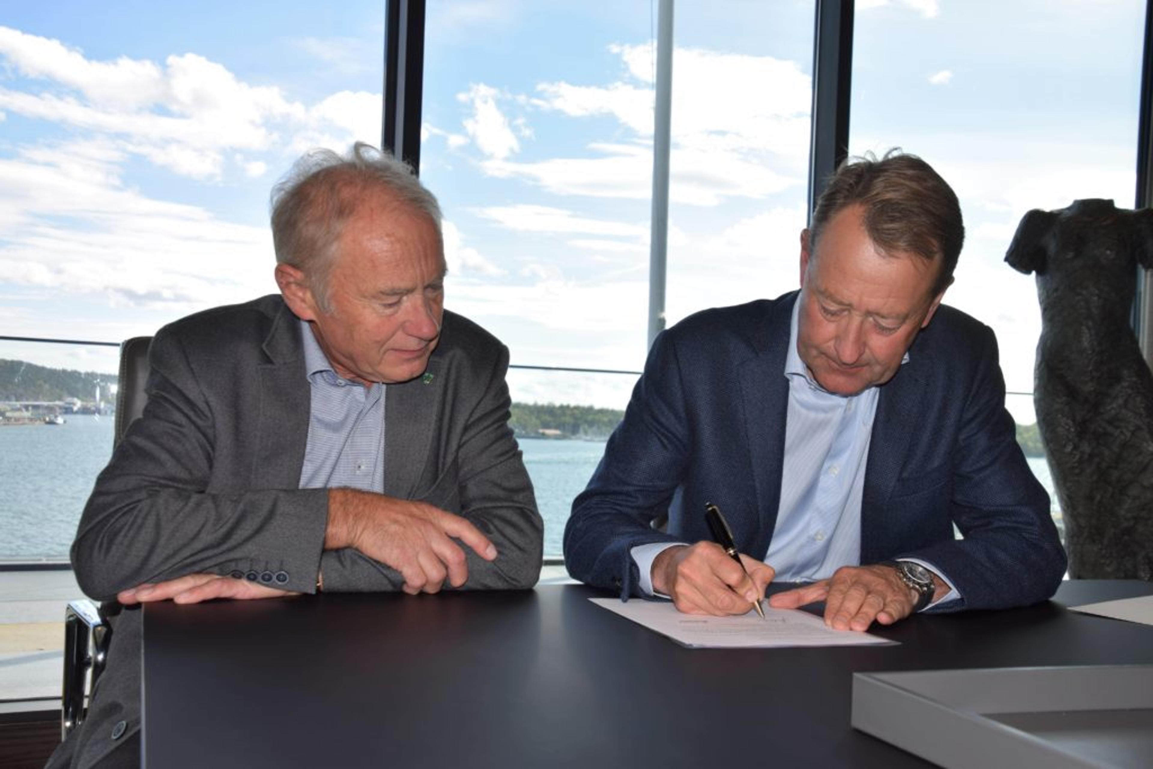 GENERØS GAVE: Avskjedsgaven fra Gjelsten holding til gamle Re kommune var i sin tid en forutsetning for å tenke så stort som våre folkevalgte i Re gjorde rundt et splitter nytt ungdomshus. Her skriver Bjørn Rune Gjelsten og gammel-ordfører i gamle Re kommune Thorvald Hillestad (SP) under på avtalen på seinsommeren for seks år siden. Arkivfoto: Stian Ormestad, ReAvisa.