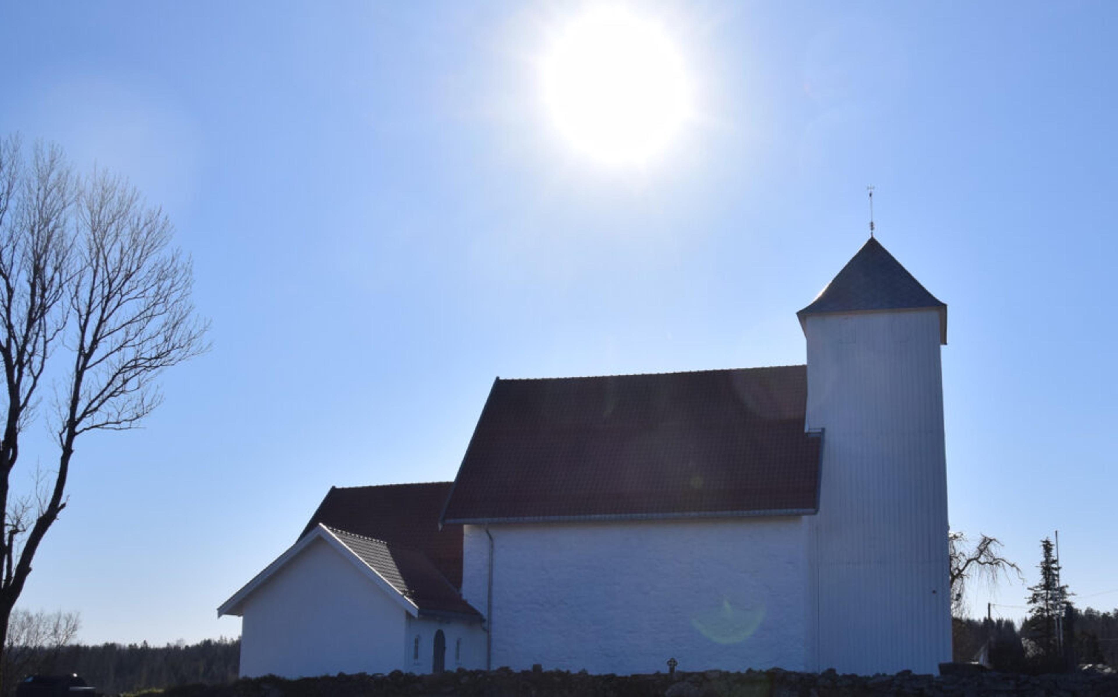 FON KIRKE: Kirka er antagelig bygd på 1100-tallet. Fon kirke er ei hvit og vakker lita steinkirke. Den ligger høyt og fritt og kan sees fra store deler av bygda. Foto: Stian Ormestad, ReAvisa.