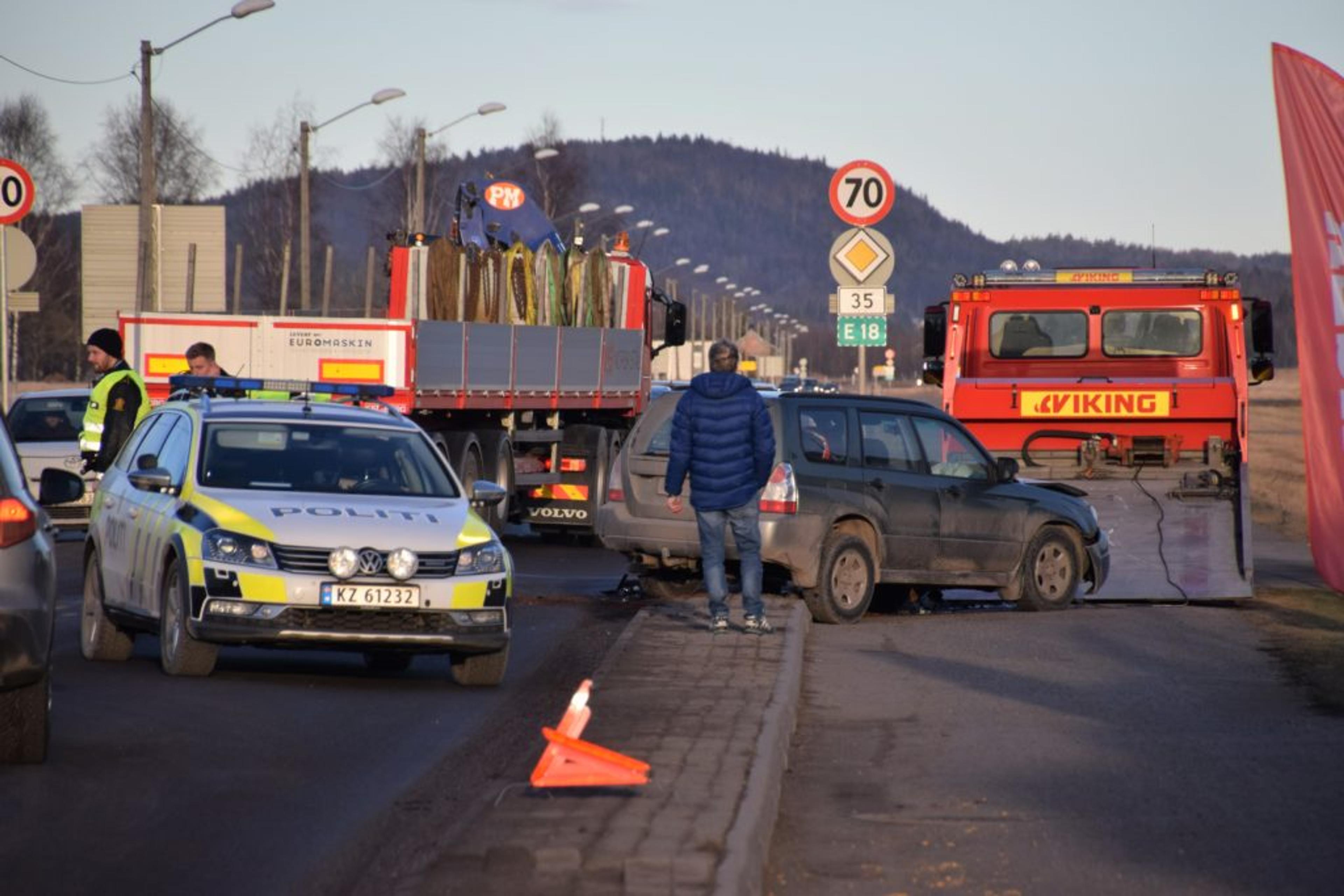 Bergingsbiler var på stedet en halvtimes tid etter ulykken. Trafikken blir dirigert forbi fram til bergningsjobben er gjort.