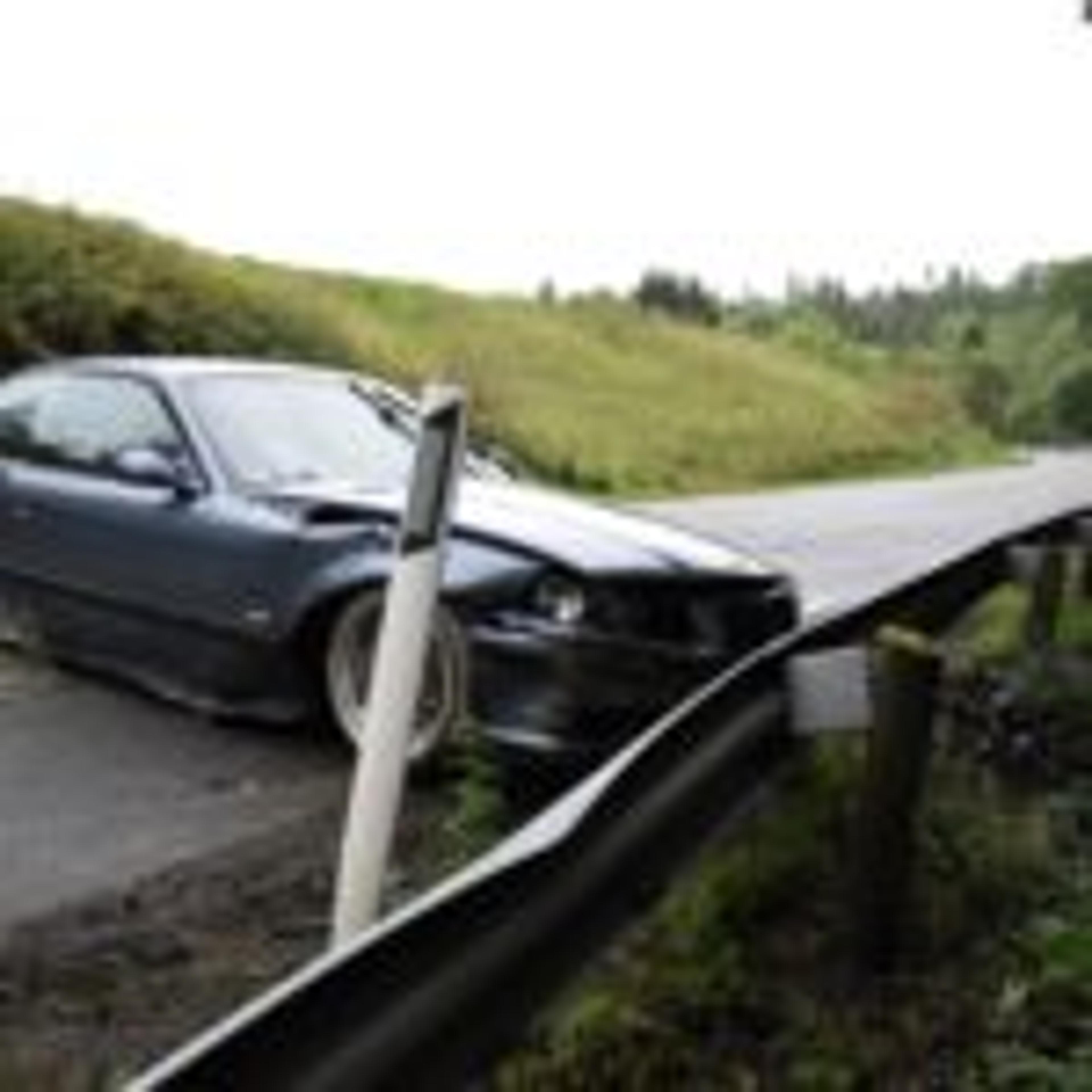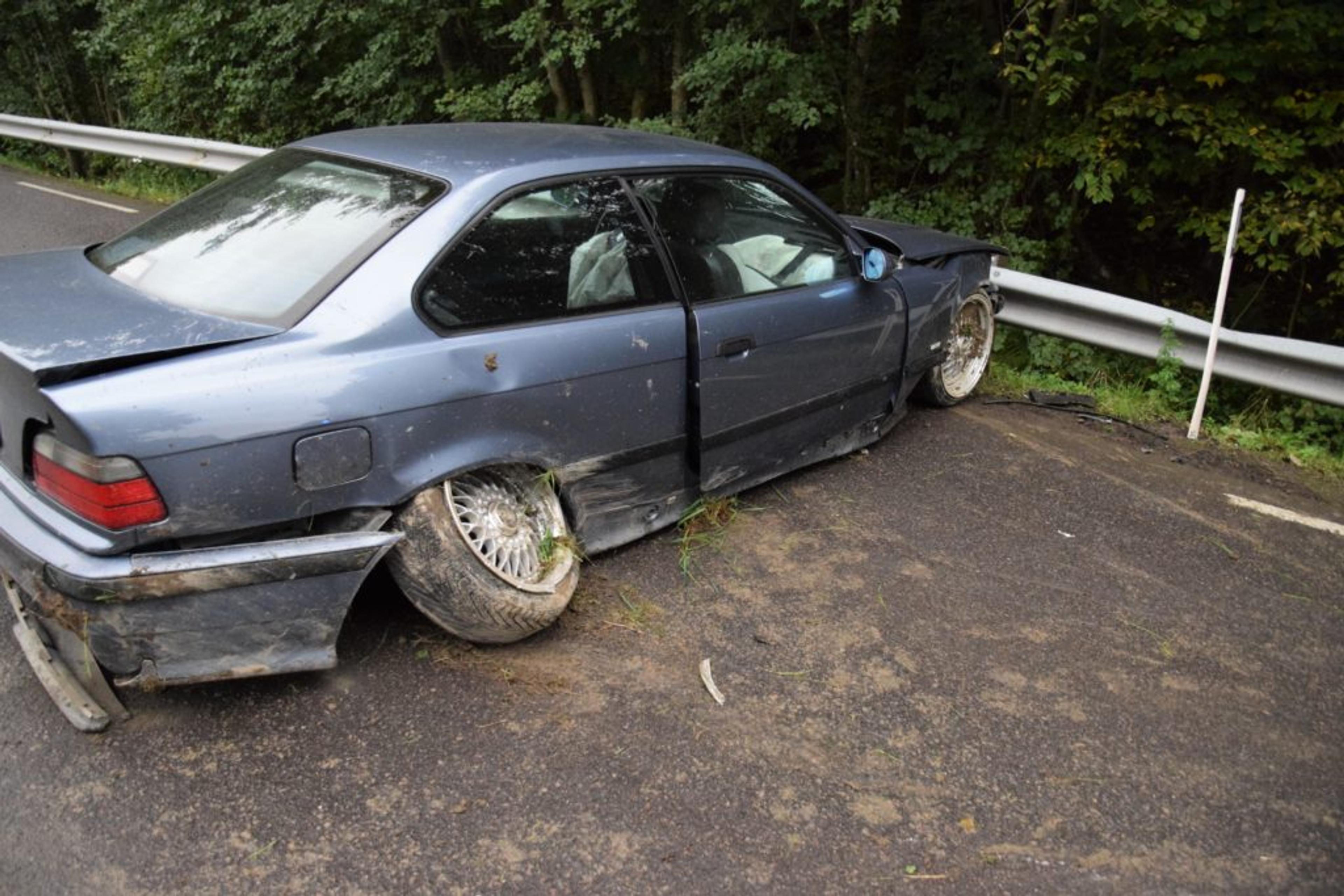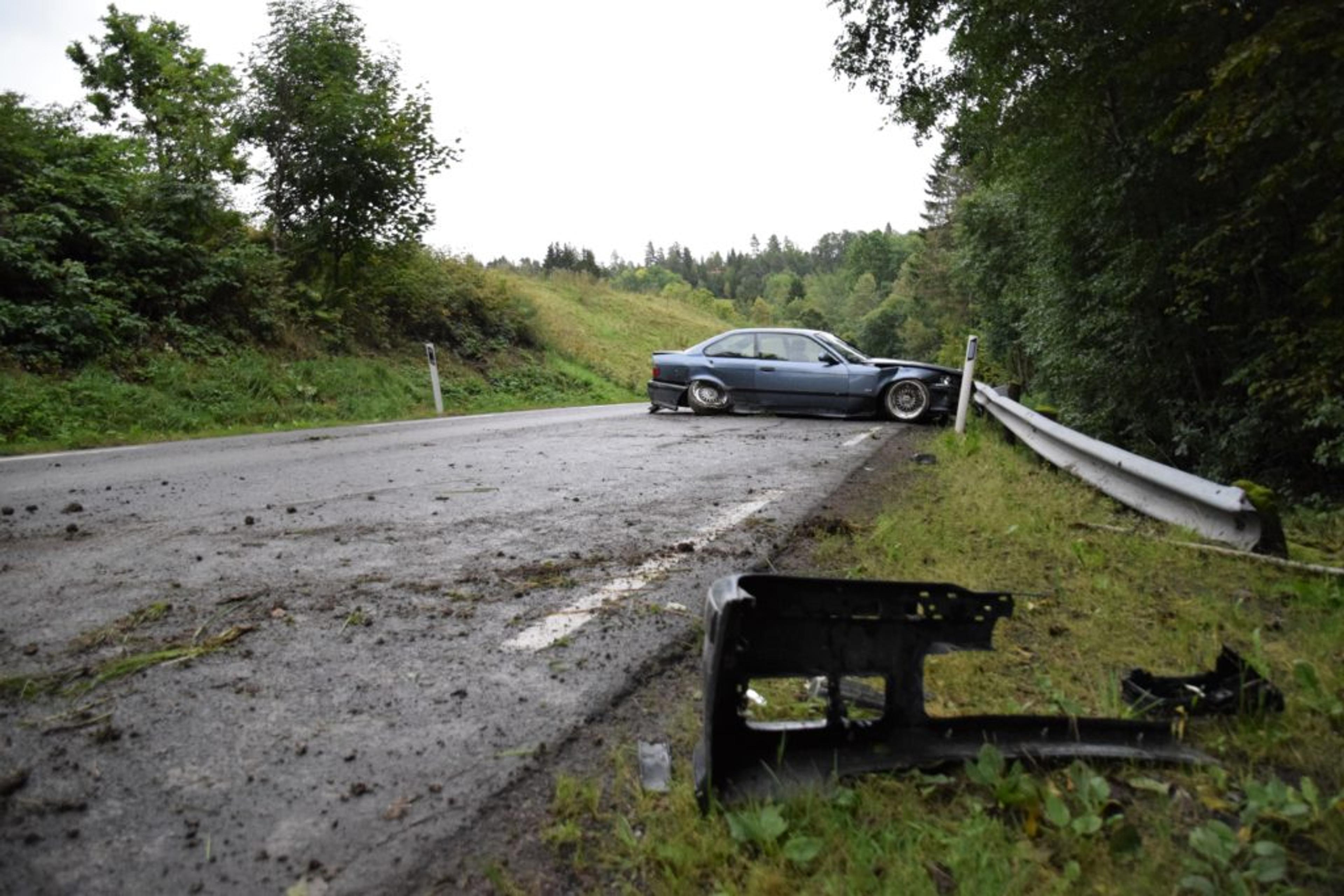 STORE MATERIELLE SKADER: BMW-en er tydelig prega av utforkjøring først på venstre side av veien, så bom stopp i autovernet på høyre side. Foto: Stian Ormestad.