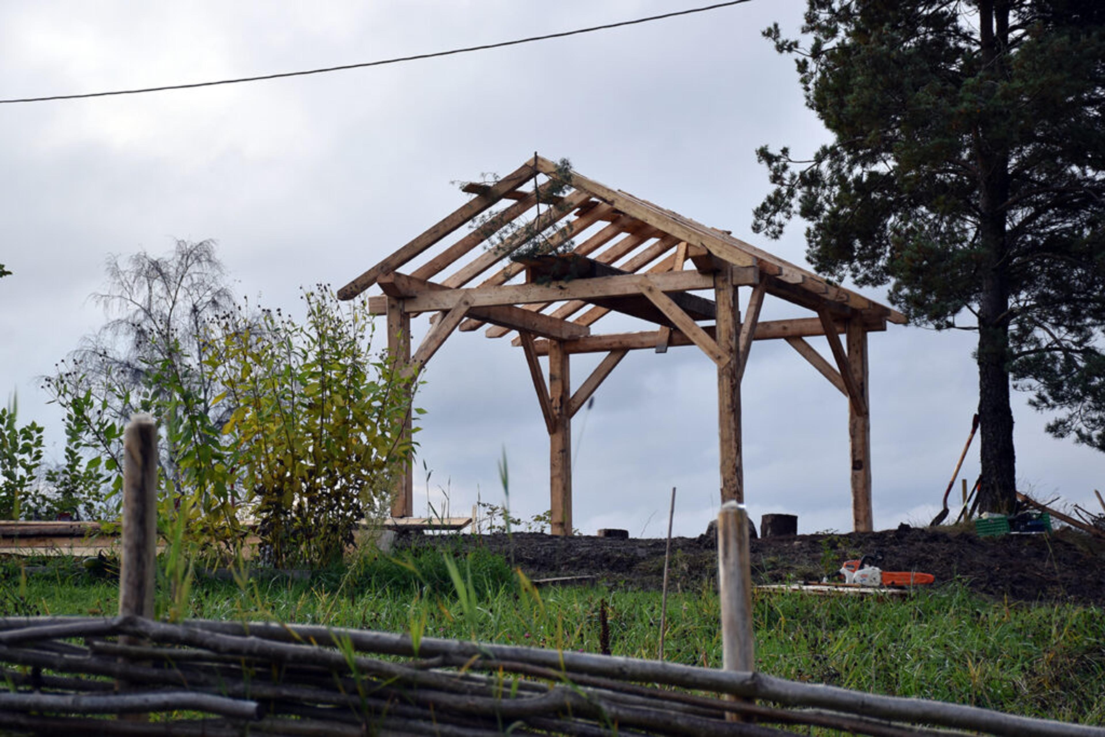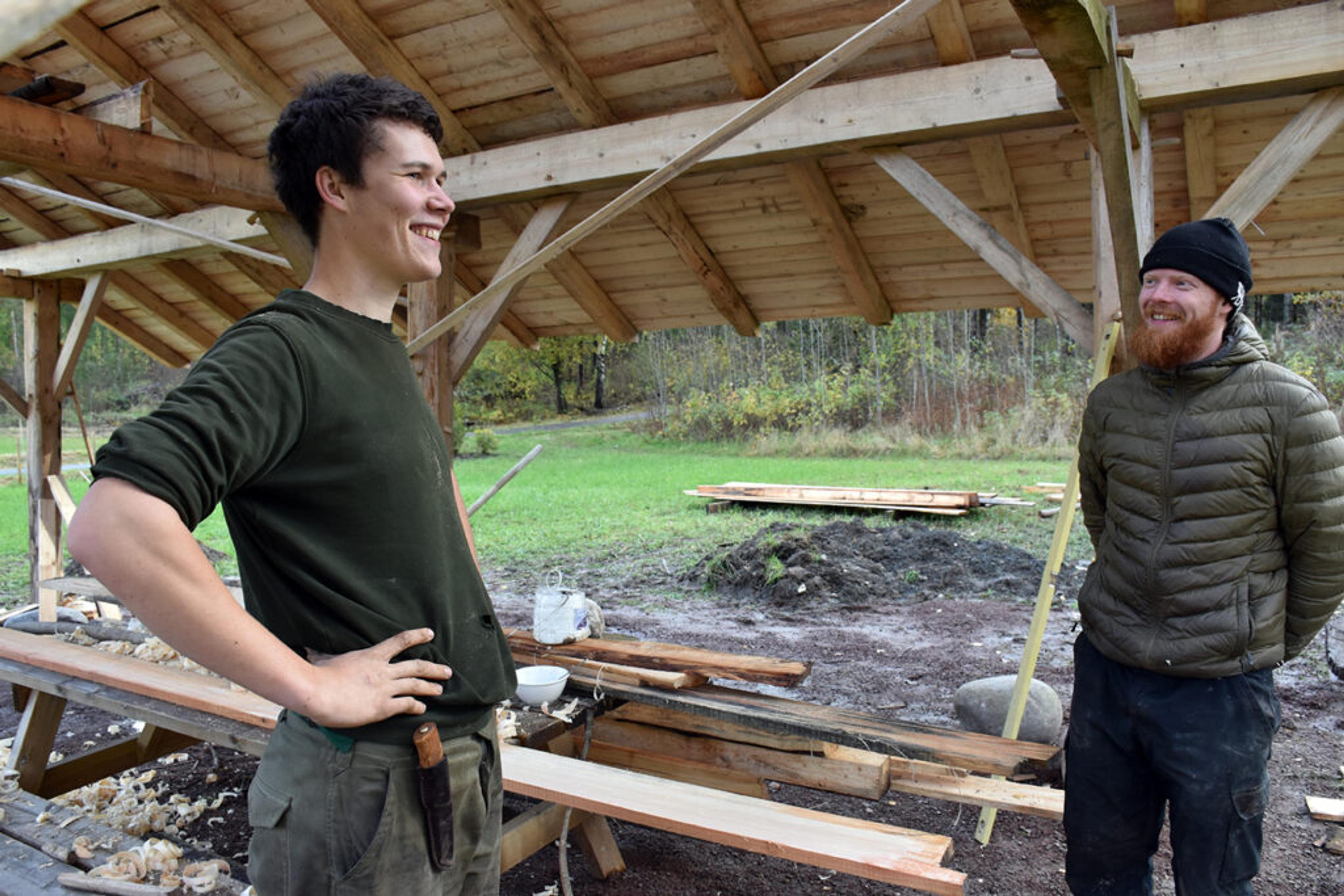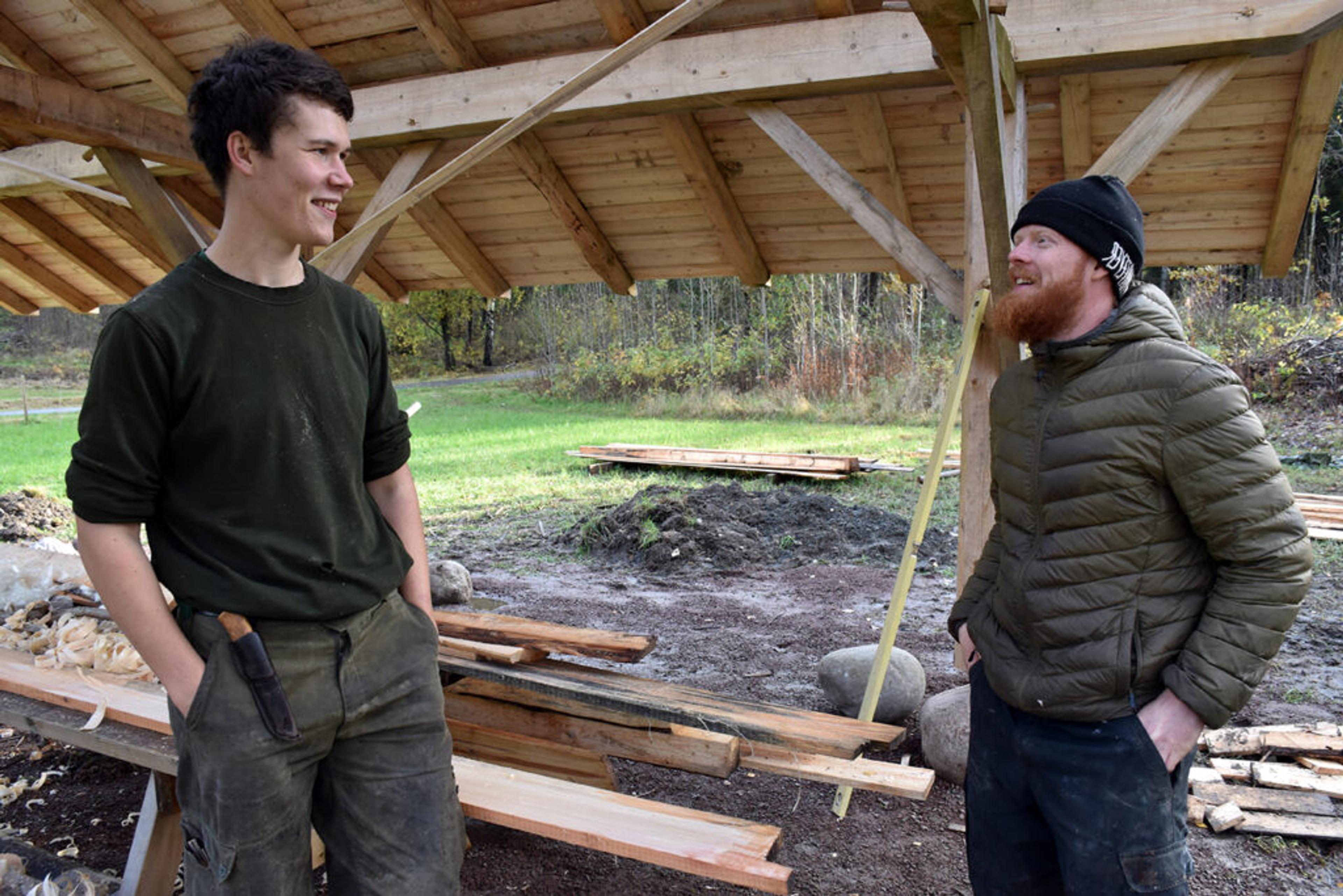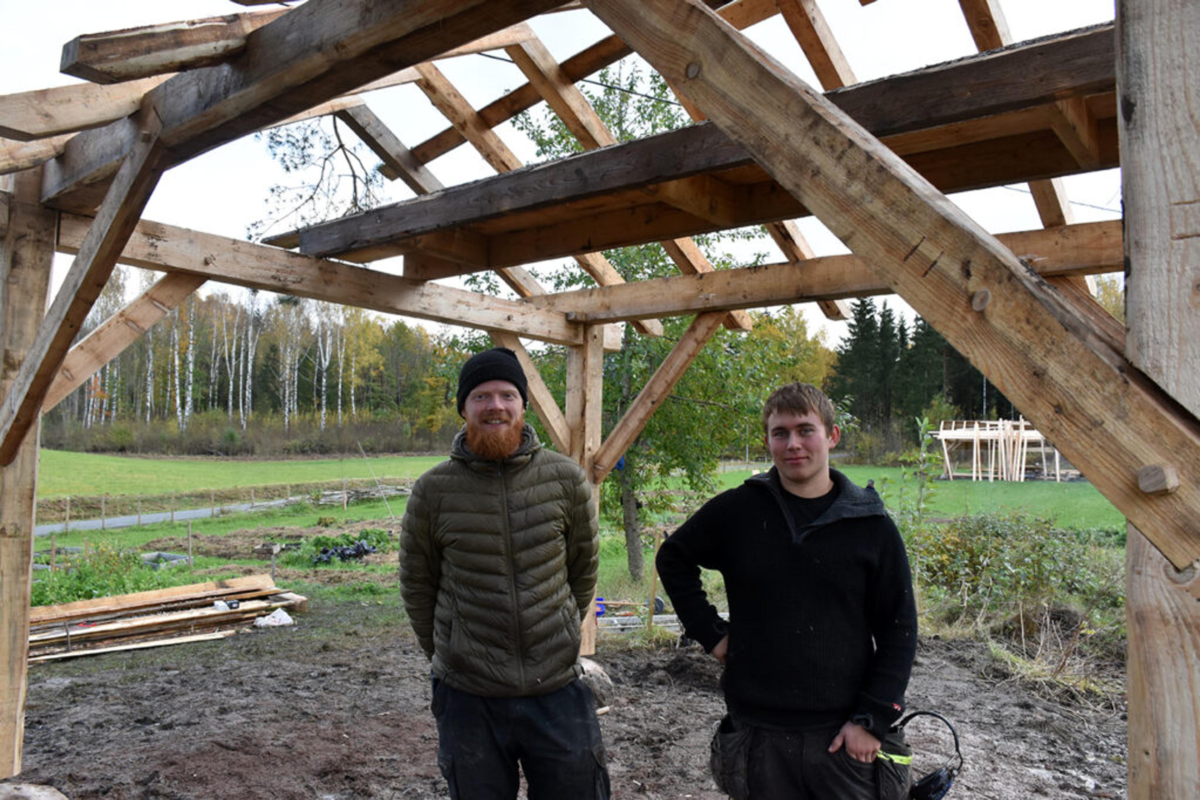 Martin Lefsaker arrangerer kurs hjemme på Holt gård, og har god hjelp av barndomskompis Torje Ormestad Larsen med å reise byggene, også han studerer og jobber med gamle byggeskikker.